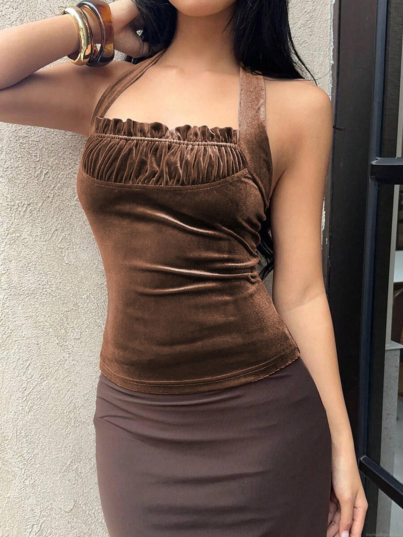 • Women Retro Halter Velvet Tank Top Sexy Backless Pleated Sleeveless Cami Top Slim Fit Crop Top For Party Streetwear Clubwear Brown Polyester Elastane Chic Vest