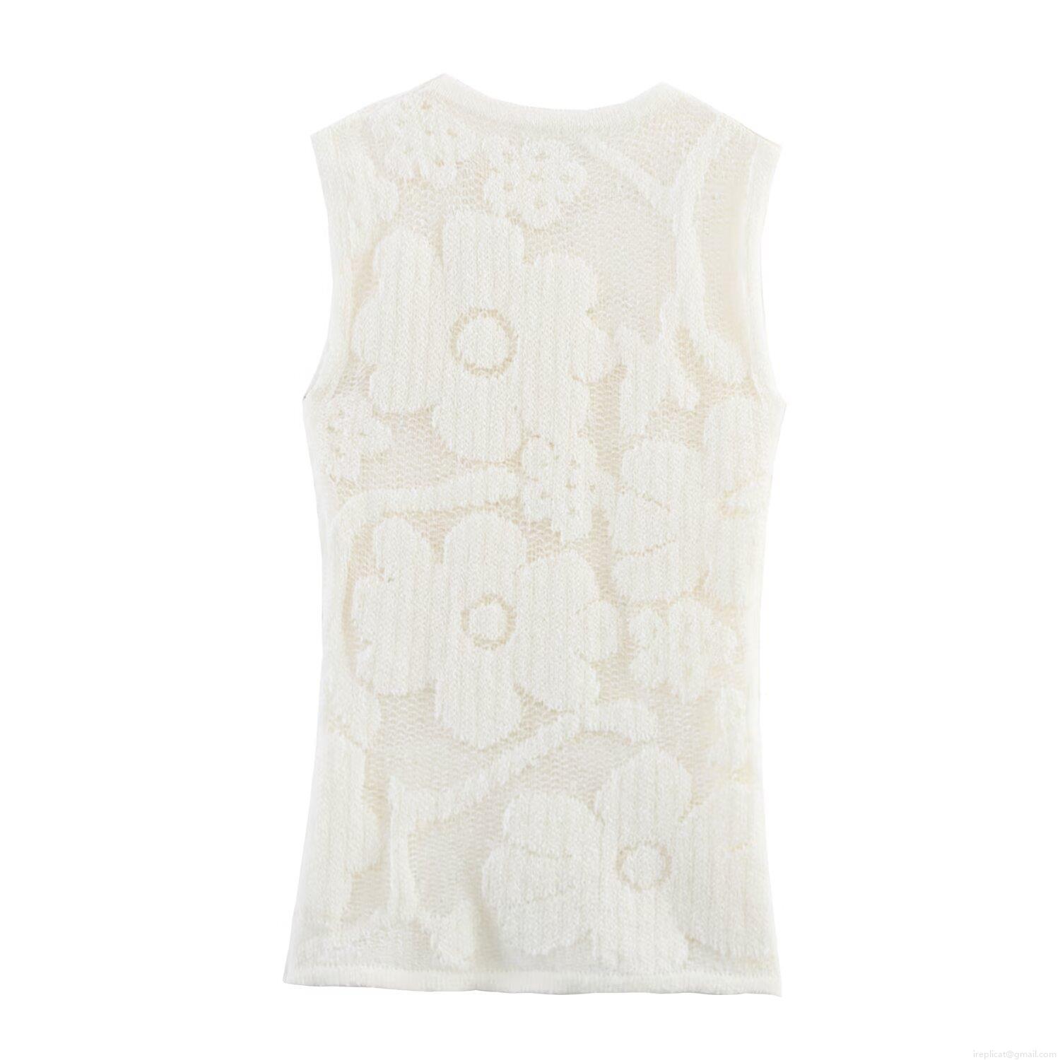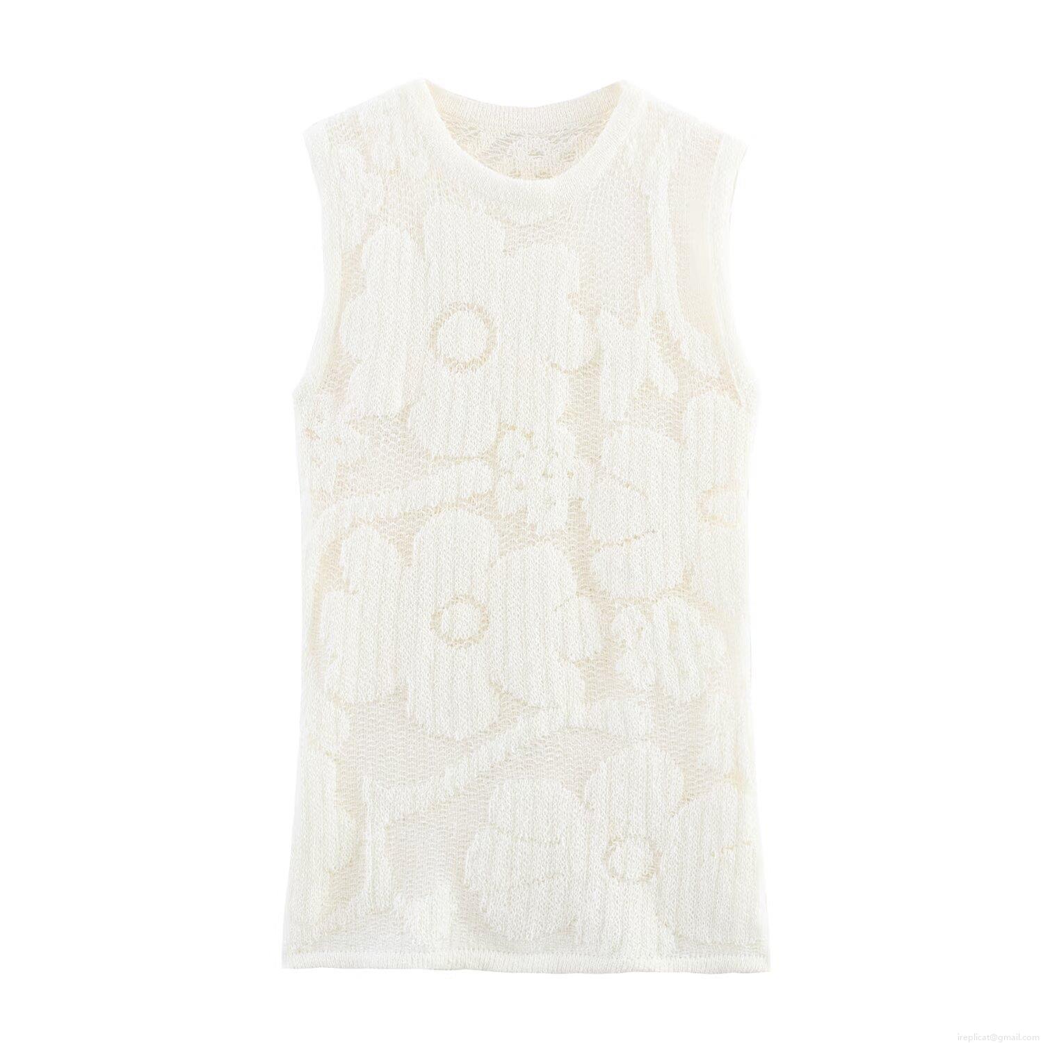 • Women Round Neck Sleeveless Knitted Tank Top Hollow Floral Lace Summer Casual Streetwear Polyester Vest T-Shirt Tops
