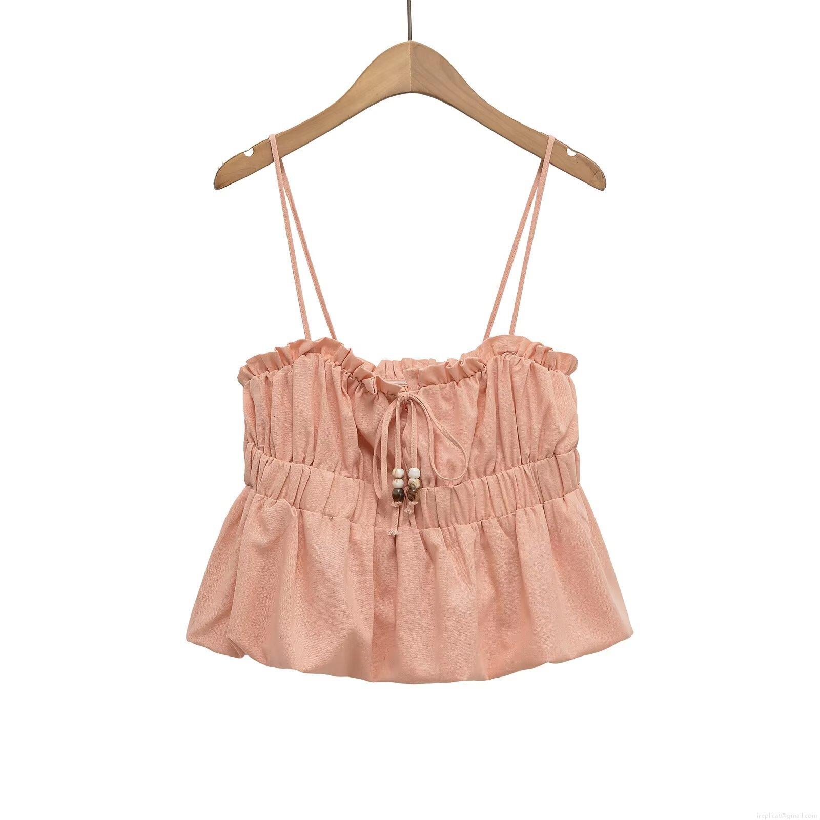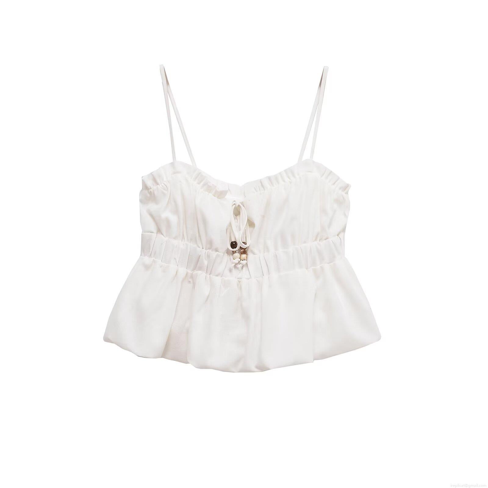 • Women Sexy Backless Cropped Camisole With Tie-Up Front Bead Decor Ruffled Hem Smocked Waist Polyester Sleeveless Tank Top For Summer Vacation Streetwear
