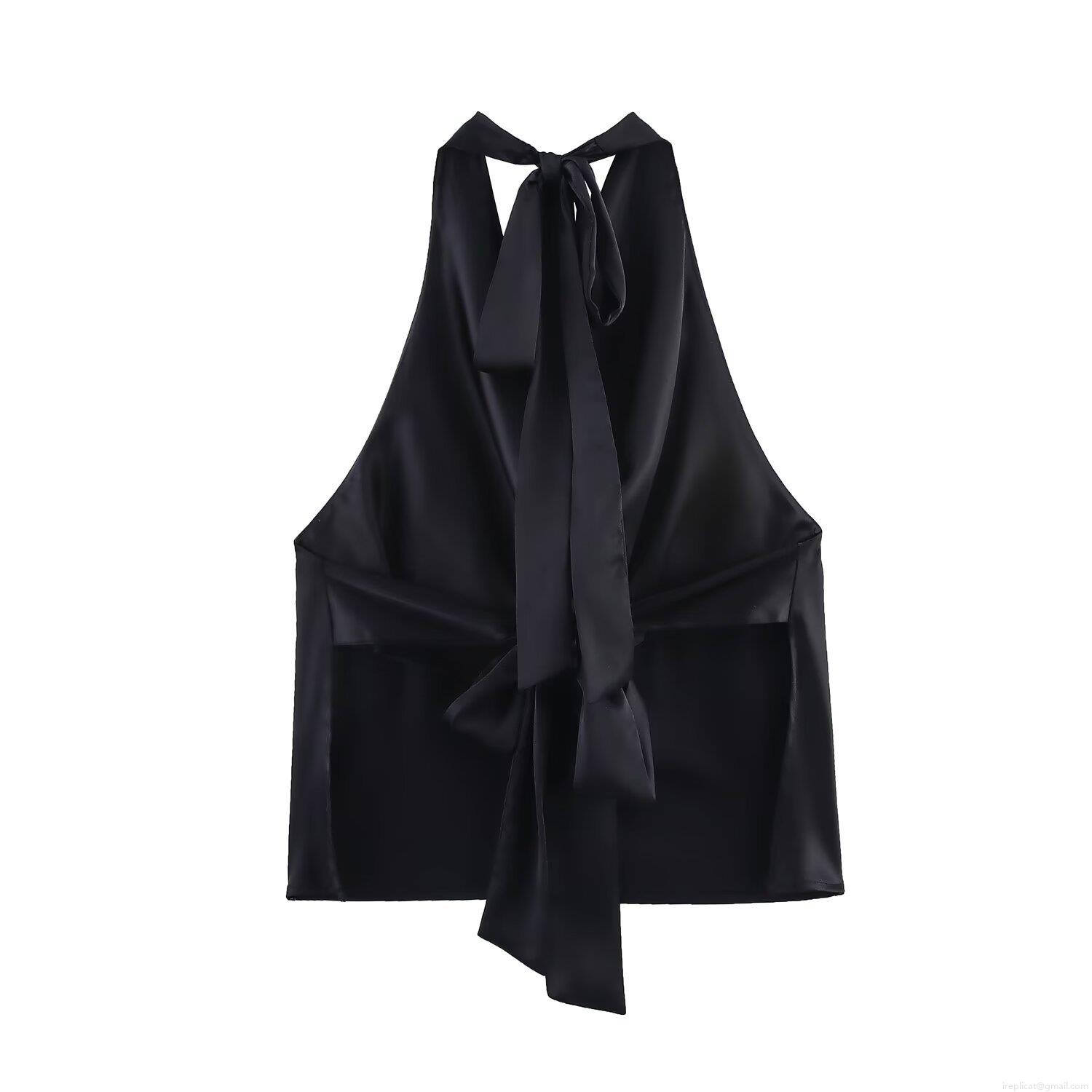 Women Sexy Backless Halter Top Cowl Neck Satin Sleeveless Blouse With Bow Tie Back Elegant Silk Texture Summer Camisole For Party Club Ladies