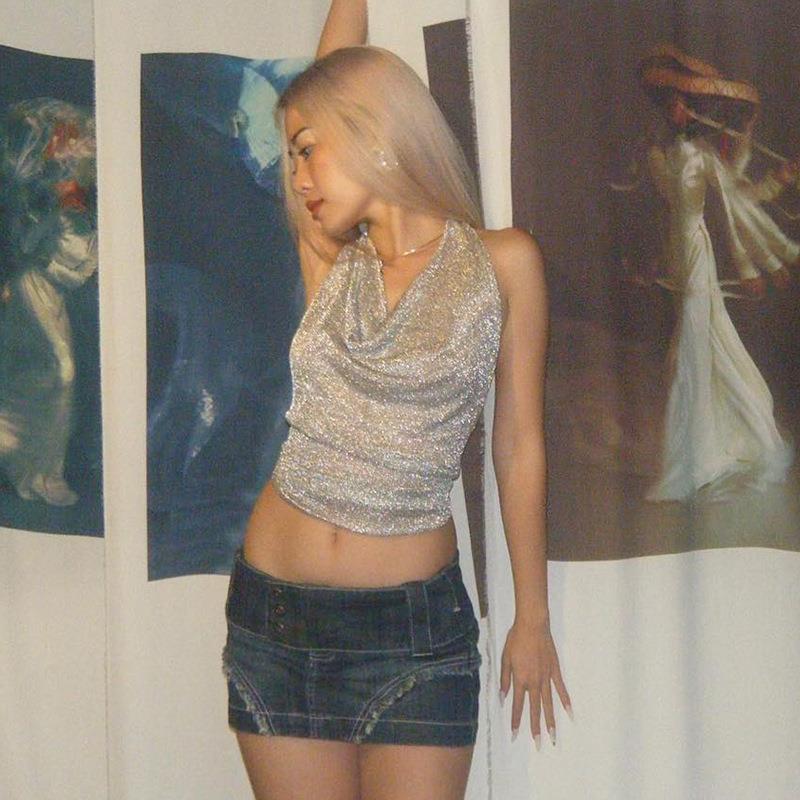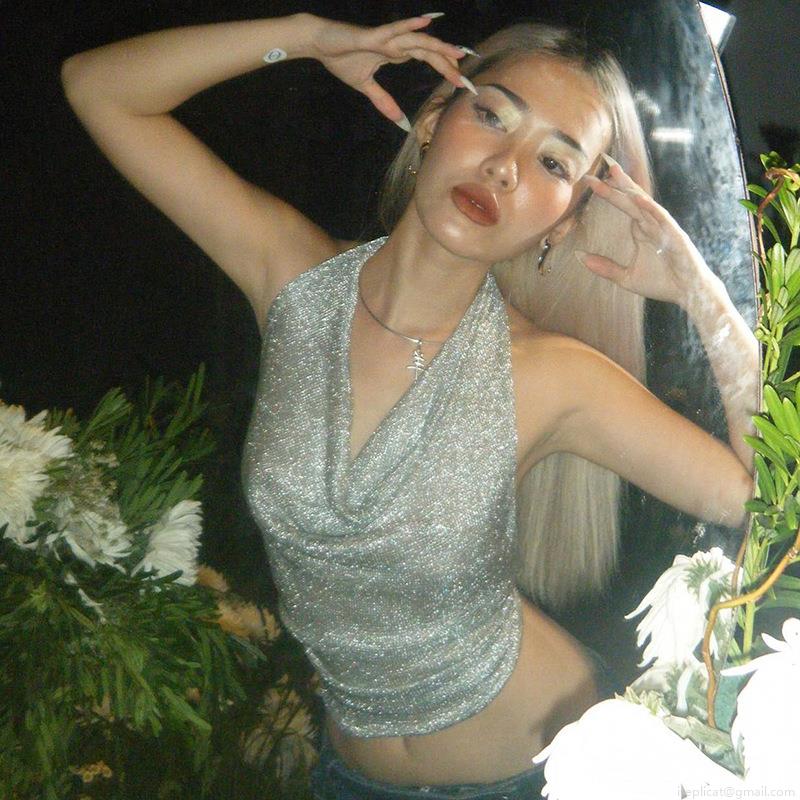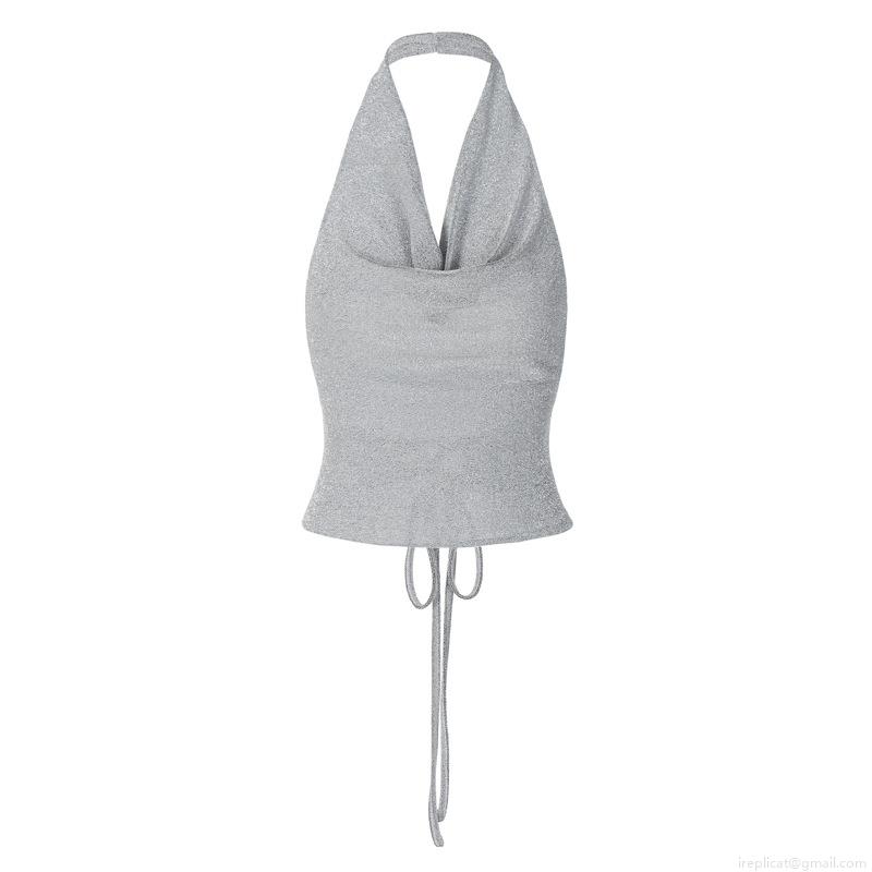 • Women Sexy Backless Halter Top Metallic Shiny Reflective Tie Up Tank Top Nightclub Party Wear Polyester Spandex Camisole Summer Slim Fit Clubwear