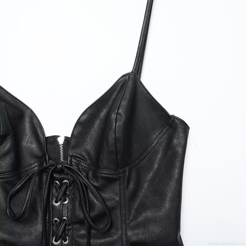 Women Sexy Black PU Faux Leather Camisole Top Lace-up Front Back Zipper V Neck Slim Fit Corset Tank Top Sleeveless Streetwear Clothing