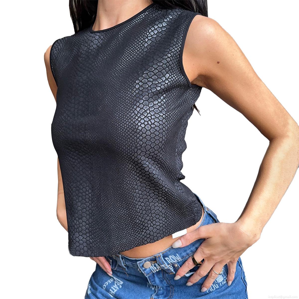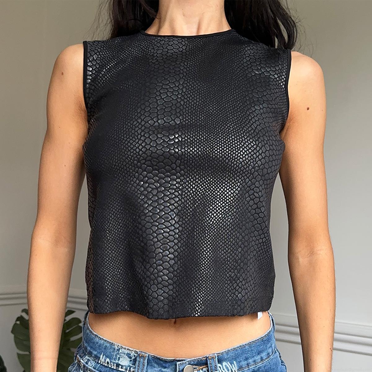 • Women Sexy Black Snakeskin Embossed Faux Leather Crop Top Sleeveless Round Neck Slim Fit Tank Top Streetwear Party Clubwear Vest