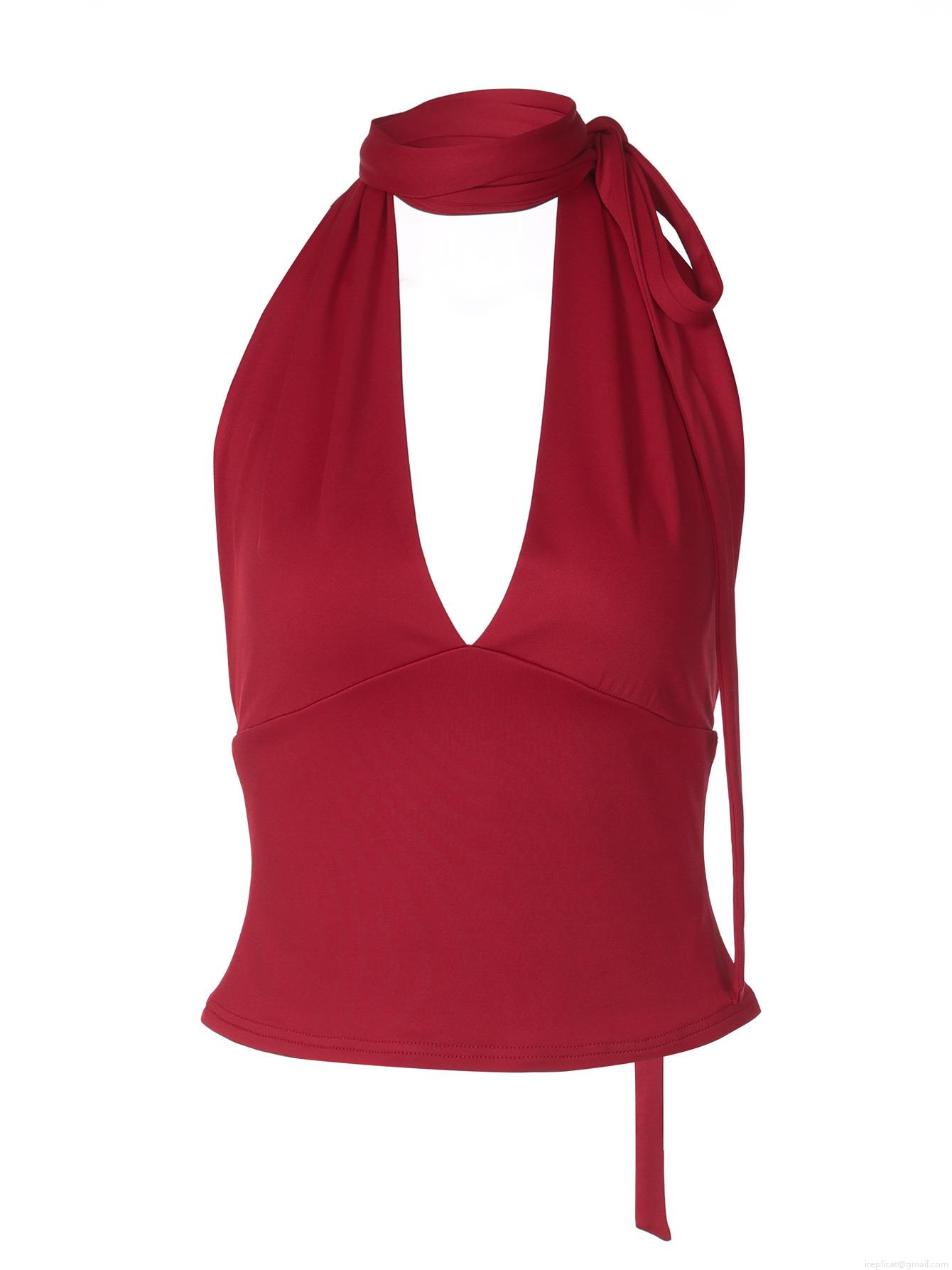 • Women Sexy Deep V Neck Halter Tank Top Backless Slim Fit Sleeveless Cropped Camisole With Choker Solid Polyester Spandex Summer Streetwear Vest