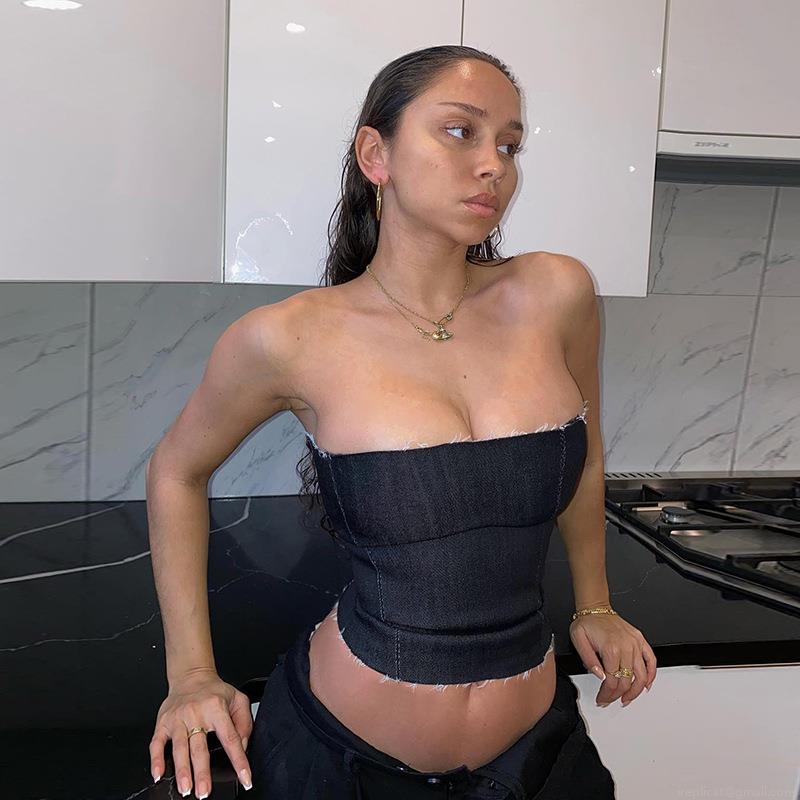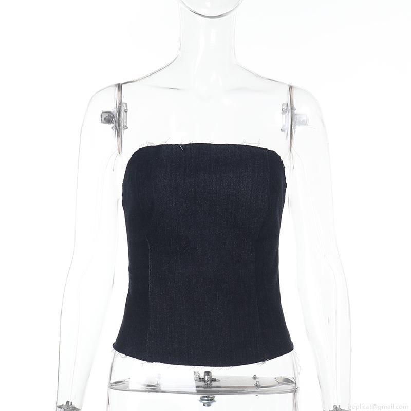 • Women Sexy Faux Denim Tube Top Raw Hem Smocked Back Crop Top Y2K Spicy Girl Slim Fit Strapless Top For Beach Vacation Daily Wear