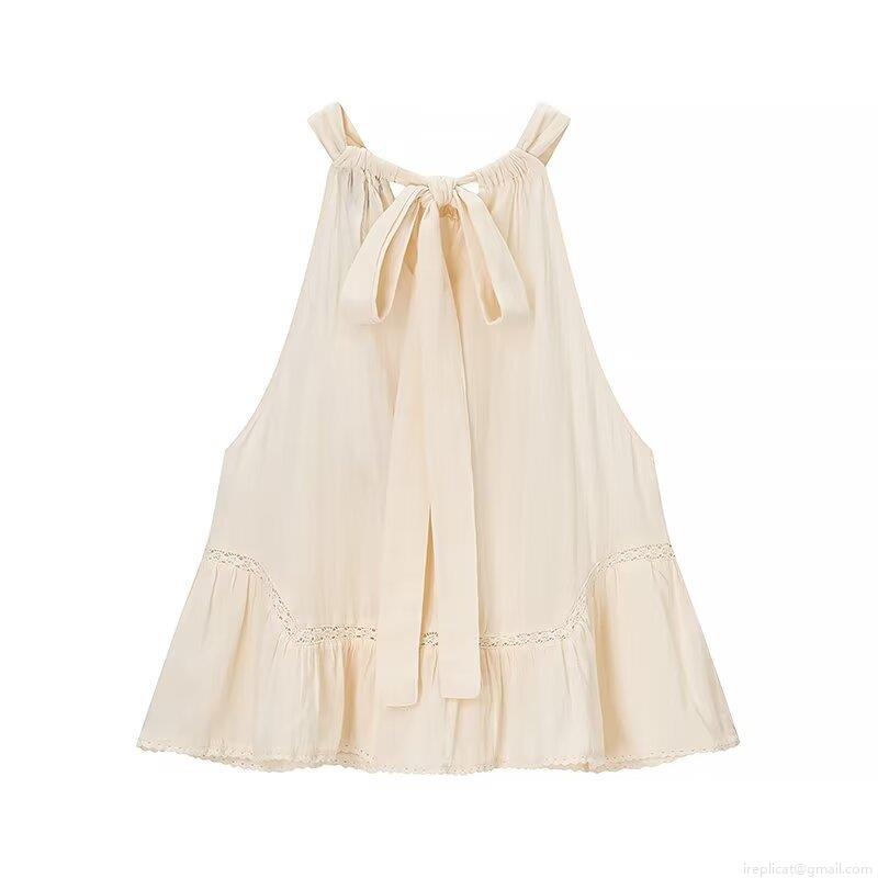 • Women Sexy Halter Neck Lace Patchwork Ruffle Hem Tank Top Backless Tie Back Pleated Sleeveless Camisole Summer Vacation Party Spice Girl Style