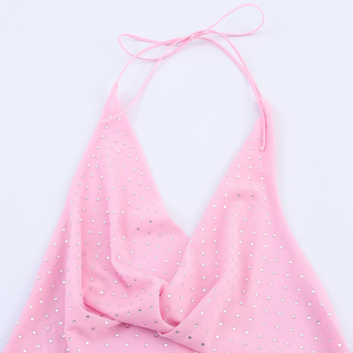 • Women Sexy Halter Top Polyester Mesh With Rhinestones Backless Crop Top For Party Clubwear Summer Y2K Fashion Sleeveless Vest