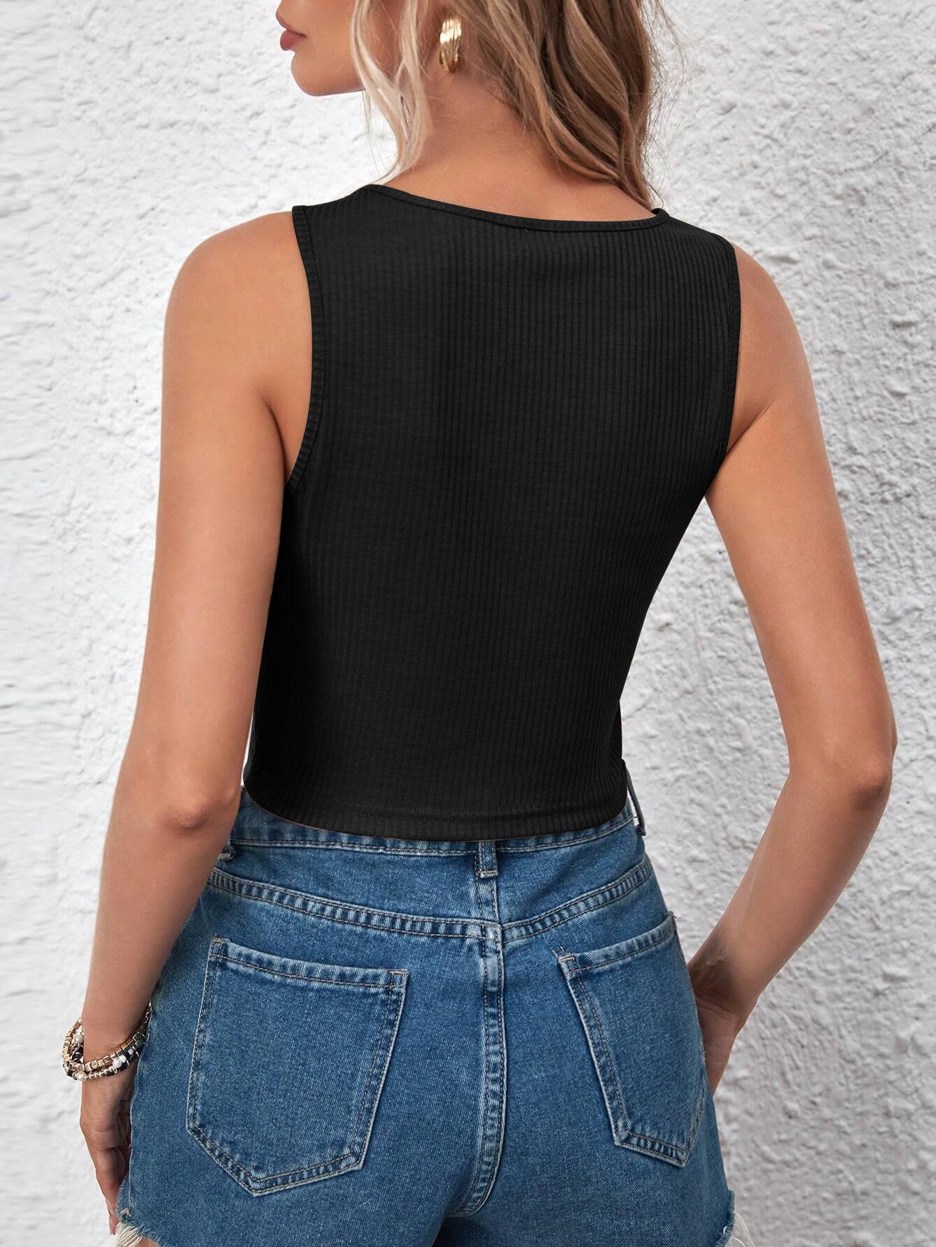 • Women Sexy Knot Front Ribbed Knit Crop Tank Top Sleeveless Polyester Spandex Slim Fit Vest For Summer Casual Party Dating Daily Wearing