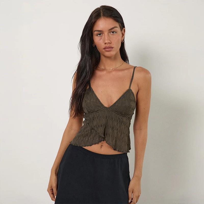 • Women Sexy Lace Camisole Slim Fit V Neck Irregular Hem Crop Top Nylon Spandex Brown Sleeveless Vest For Summer Party Clubwear Streetwear