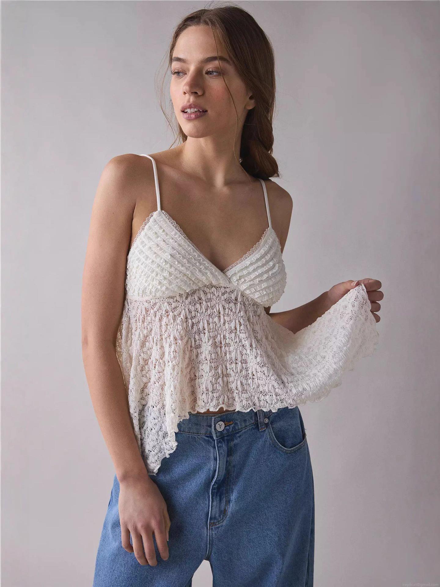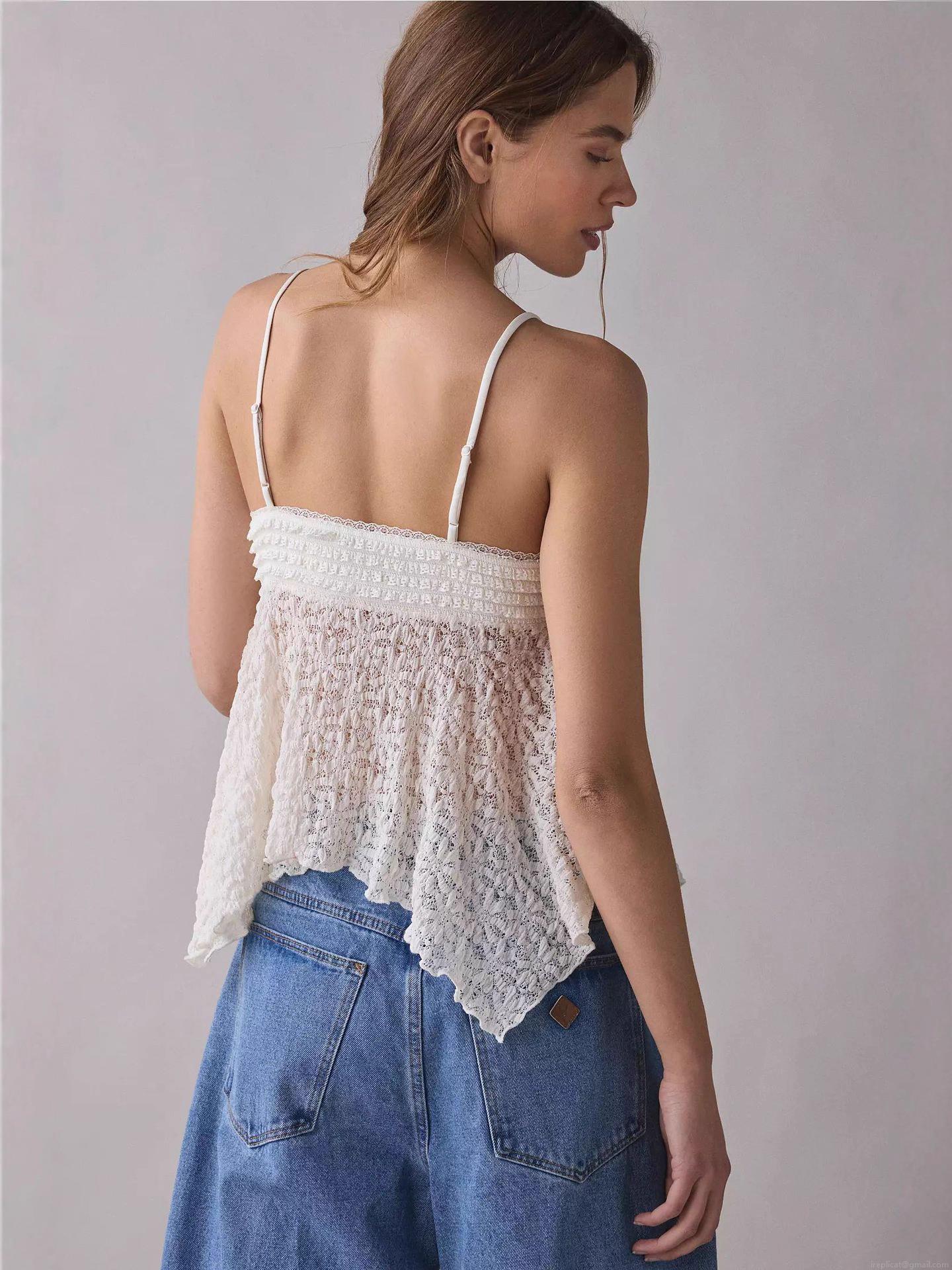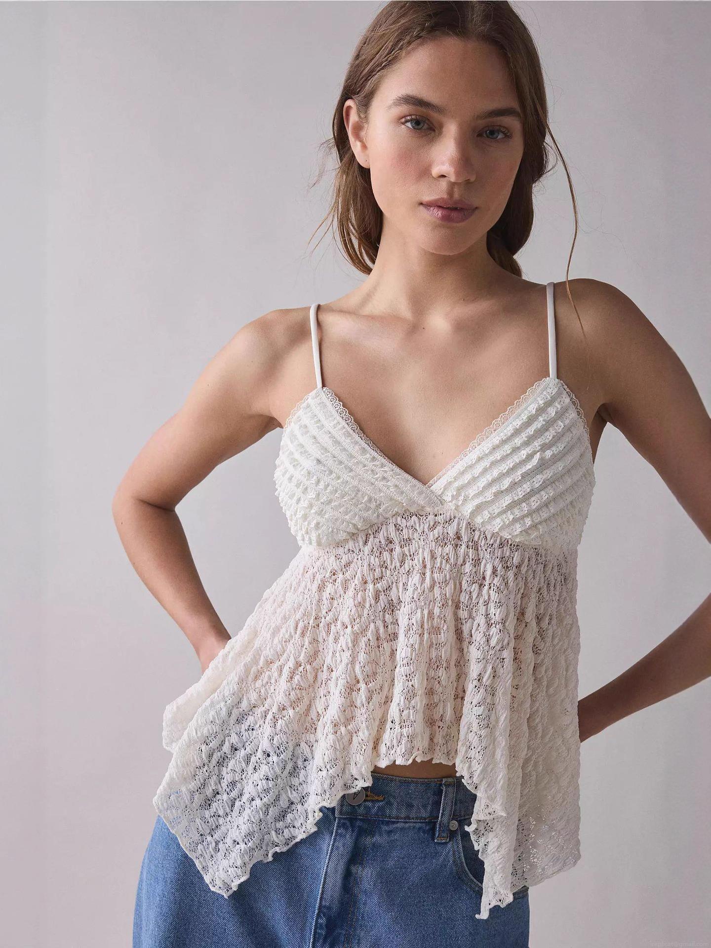 Women Sexy Lace Camisole V-Neck Spaghetti Strap Top With Irregular Hem Crochet Patchwork Sweet Style Summer Sleeveless Tank Top