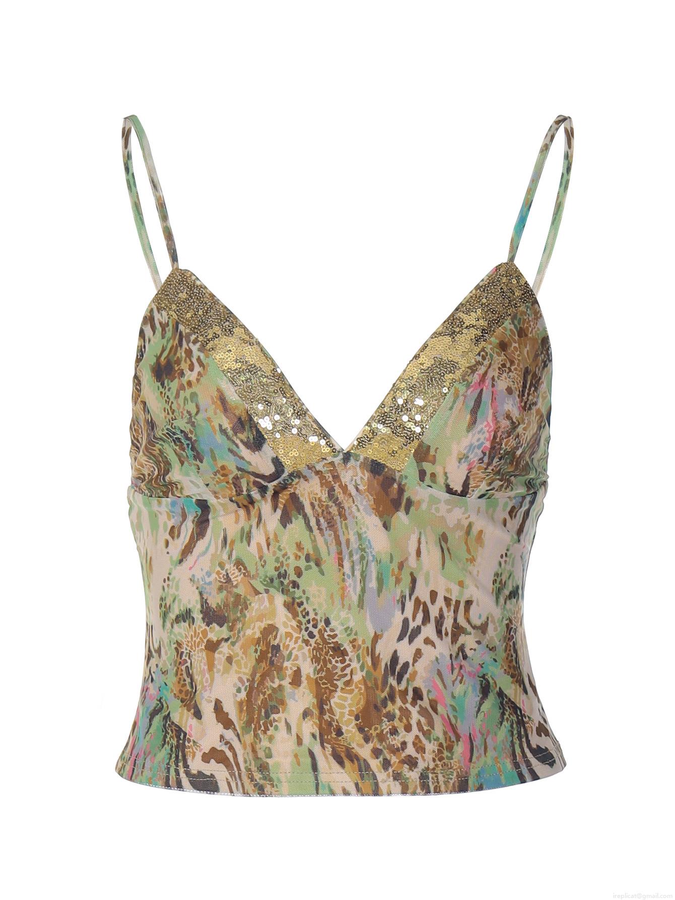 • Women Sexy Lace Patchwork Deep V-Neck Sequin Camisole Slim Fit Backless Crop Top Clubwear Party Y2K Aesthetic Leopard Print Sleeveless Vest