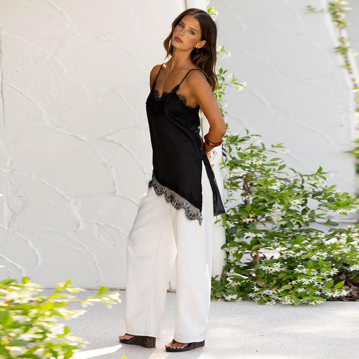 Women Sexy Lace Satin Camisole V-Neck Irregular Hem Backless Tank Top Elegant Polyester Spandex Sleeveless Cami Top For Party Clubwear