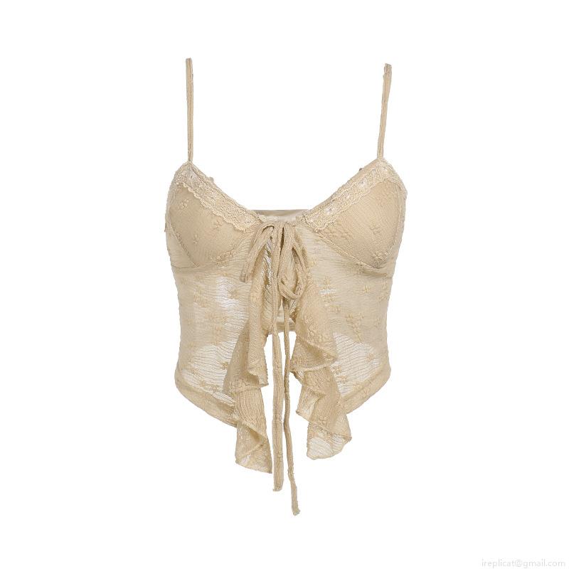 • Women Sexy Lace Tie-Front Crop Tank Top V-Neck Ruffles Floral Camisole Polyester Spandex Sleeveless Vest For Summer Party Club