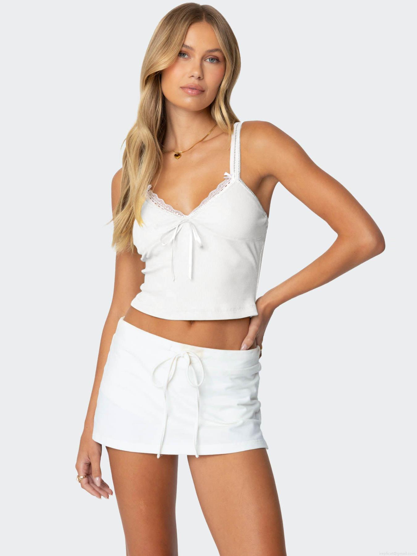 • Women Sexy Lace Trim Ribbed Cami Top Bow Patchwork Double Straps Slim Fit Summer Tank Top Patchwork Sleeveless Vest Clubwear
