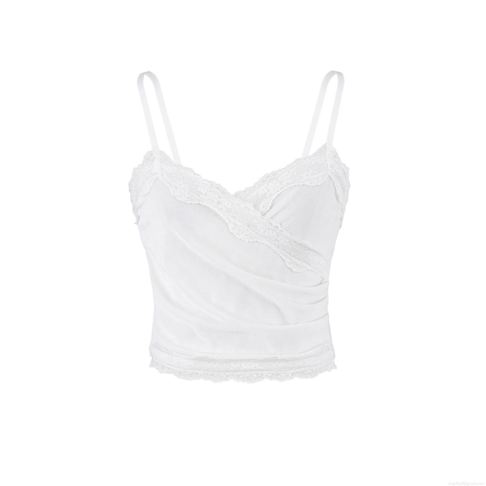 • Women Sexy Lace Trim V-Neck Cami Top Silk Finish Polyester Spandex Spaghetti Strap Slim Fit Short Tank Top For Dating Club