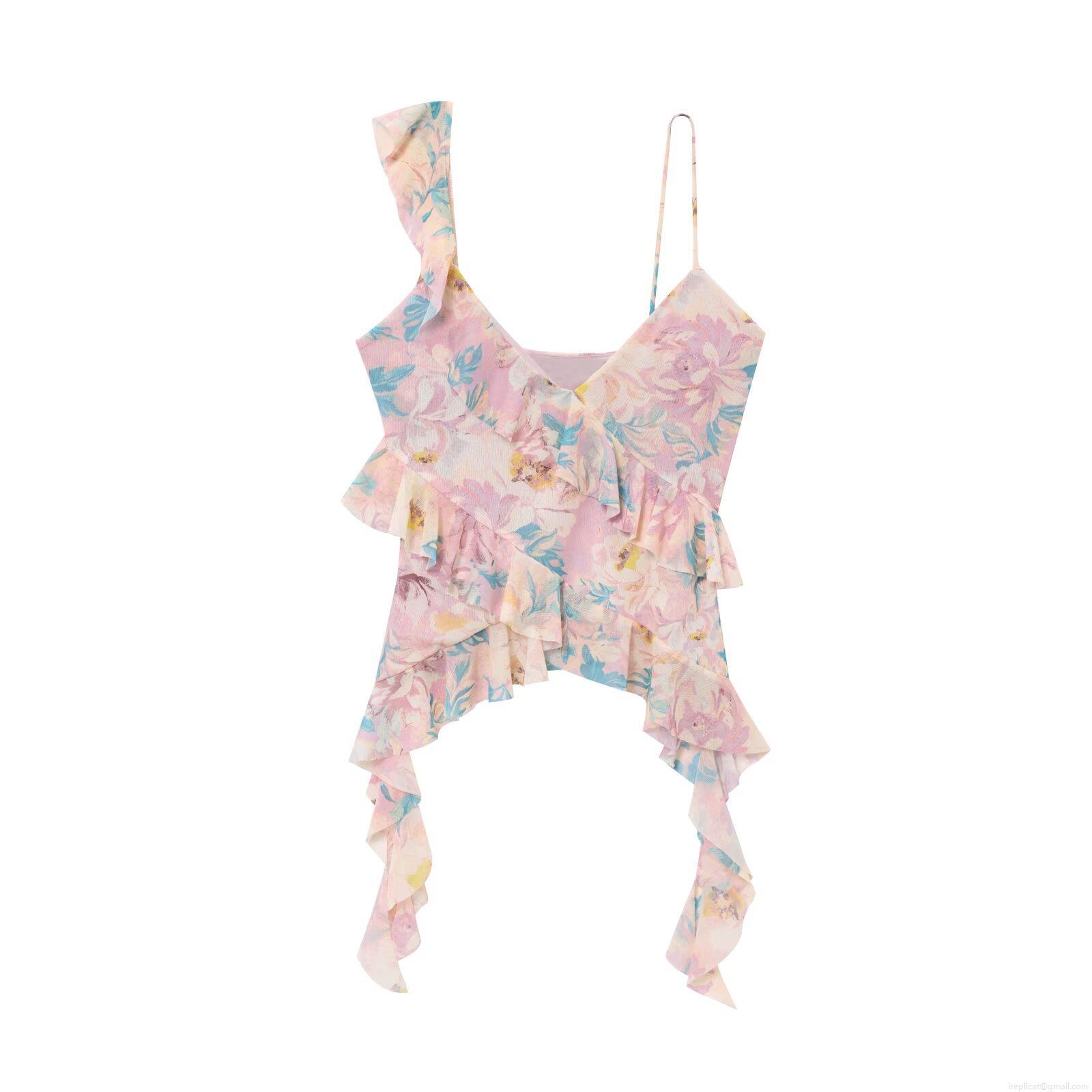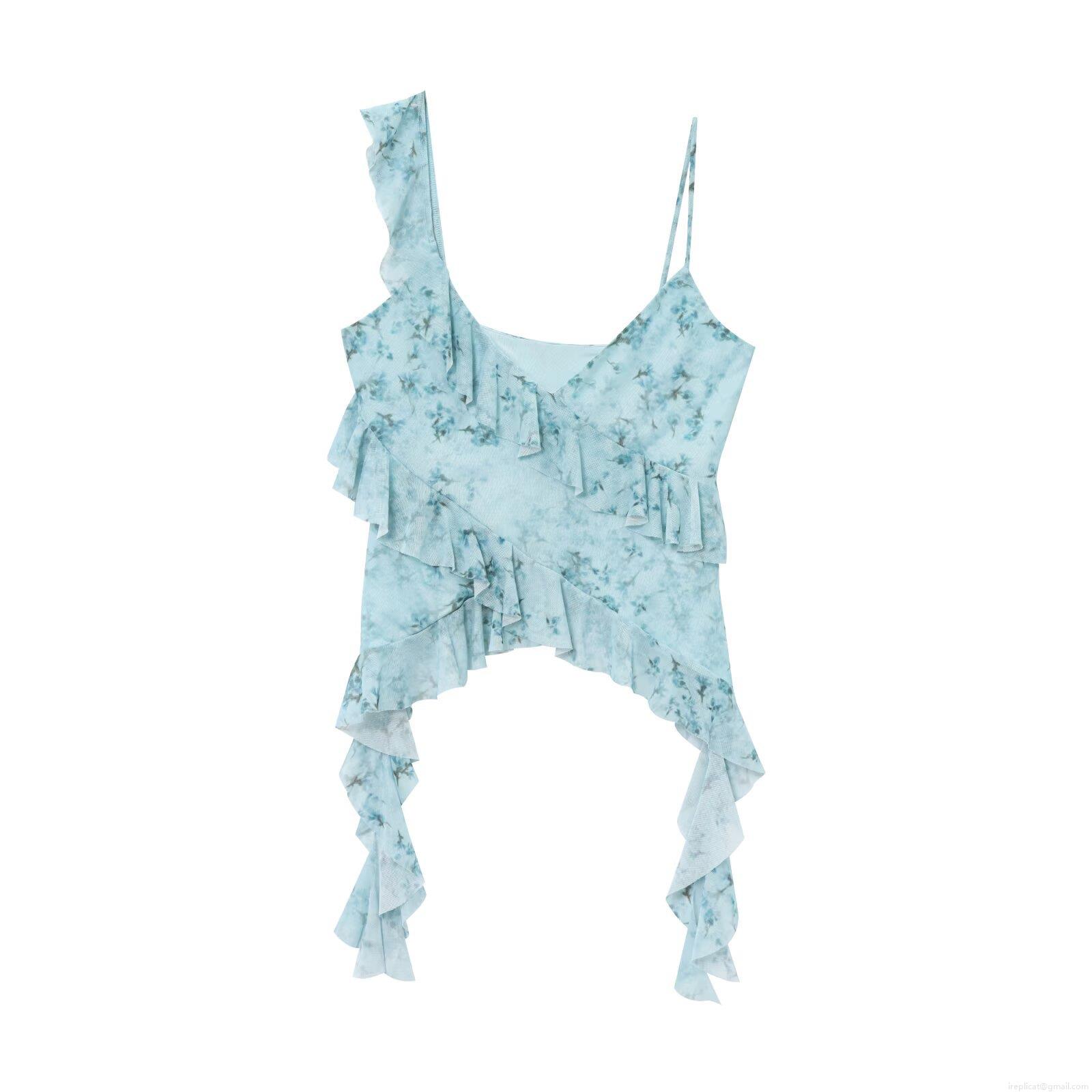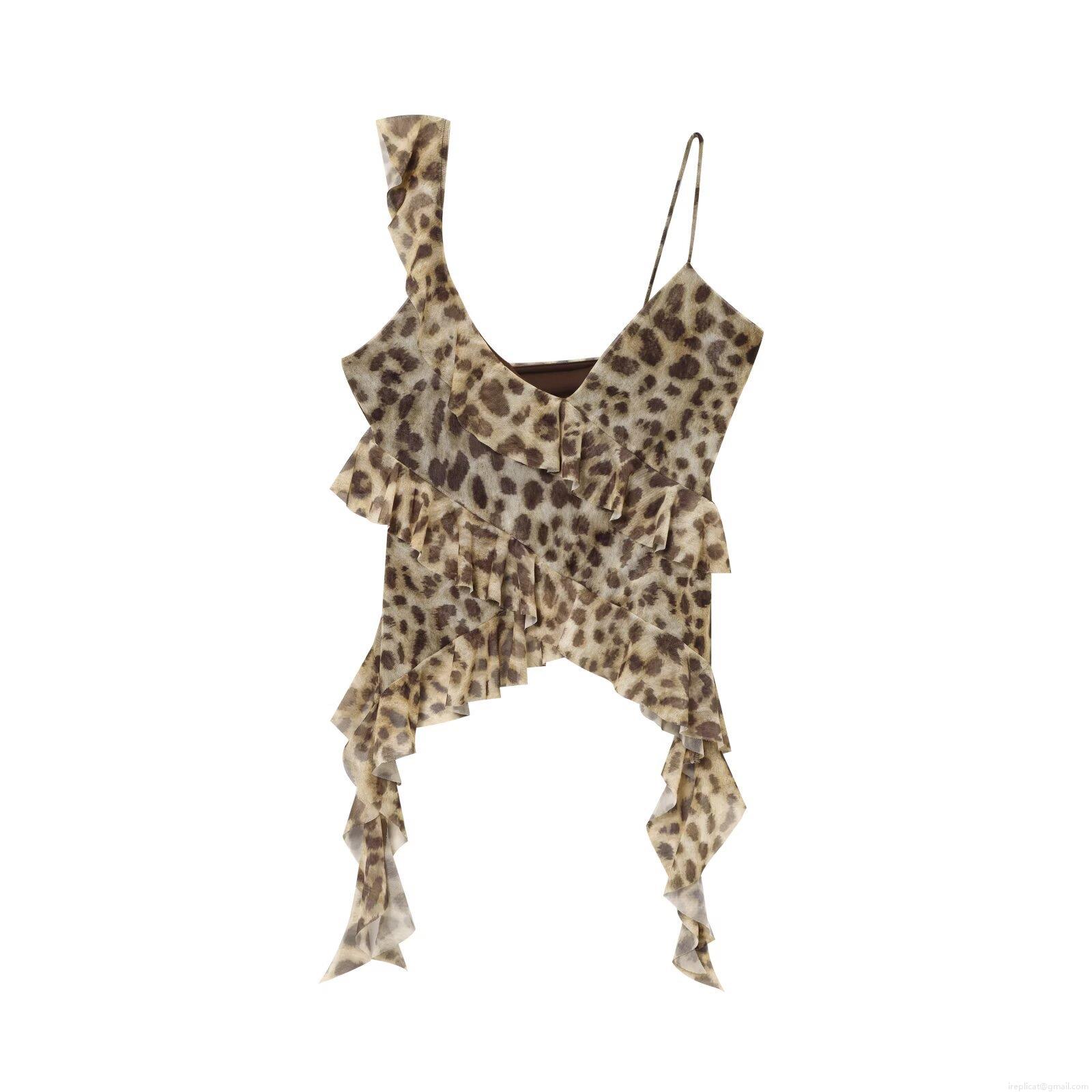 Women Sexy Mesh Polyester Ruffle Camisole Top Floral Leopard Print Asymmetric Tiered Summer Beach Party Streetwear Sleeveless Crop Top Vest Clothing