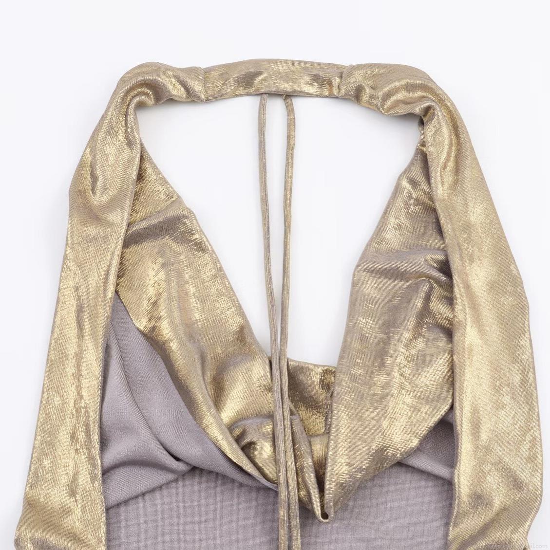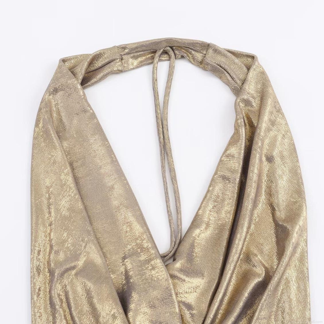• Women Sexy Metallic Halter Neck Backless Top Champagne Gold Draped Sleeveless Camisole For Party Club Night Out