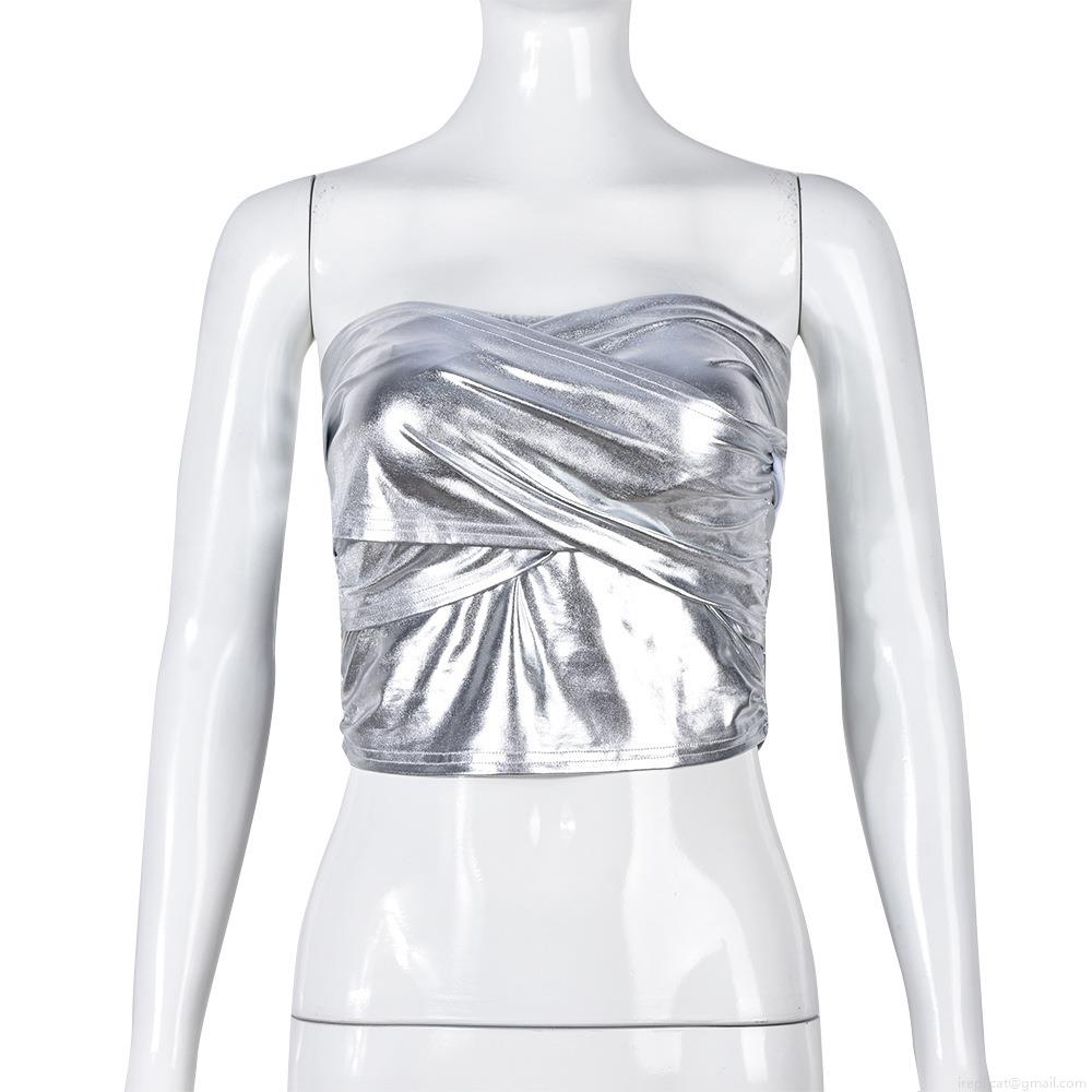 • Women Sexy Metallic Ruched Tube Top Strapless Slim Fit Crop Top For Party Clubwear Y2K Shiny Glossy Spice Girl Sleeveless Tops