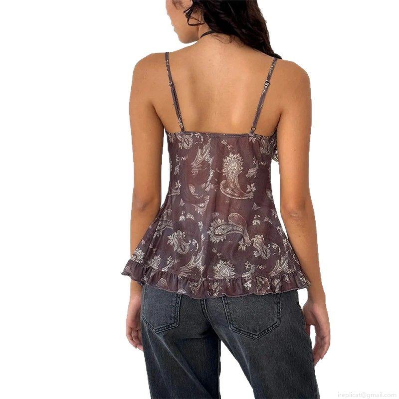 • Women Sexy Paisley Plaid Print Cami Top Polyester Mesh Ruched Ruffle Hem Crop Tank Top Summer Streetwear Vacation Outfits