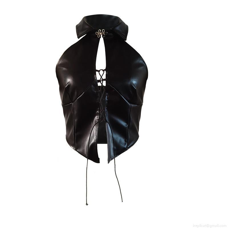 • Women Sexy PU Leather Halter Top Lace Up Cross Front Crop Top Backless Turn Down Collar Metal Flower Buckle Punk Nightclub Streetwear Black Slim Fit Waistcoat Sleeveless Vest
