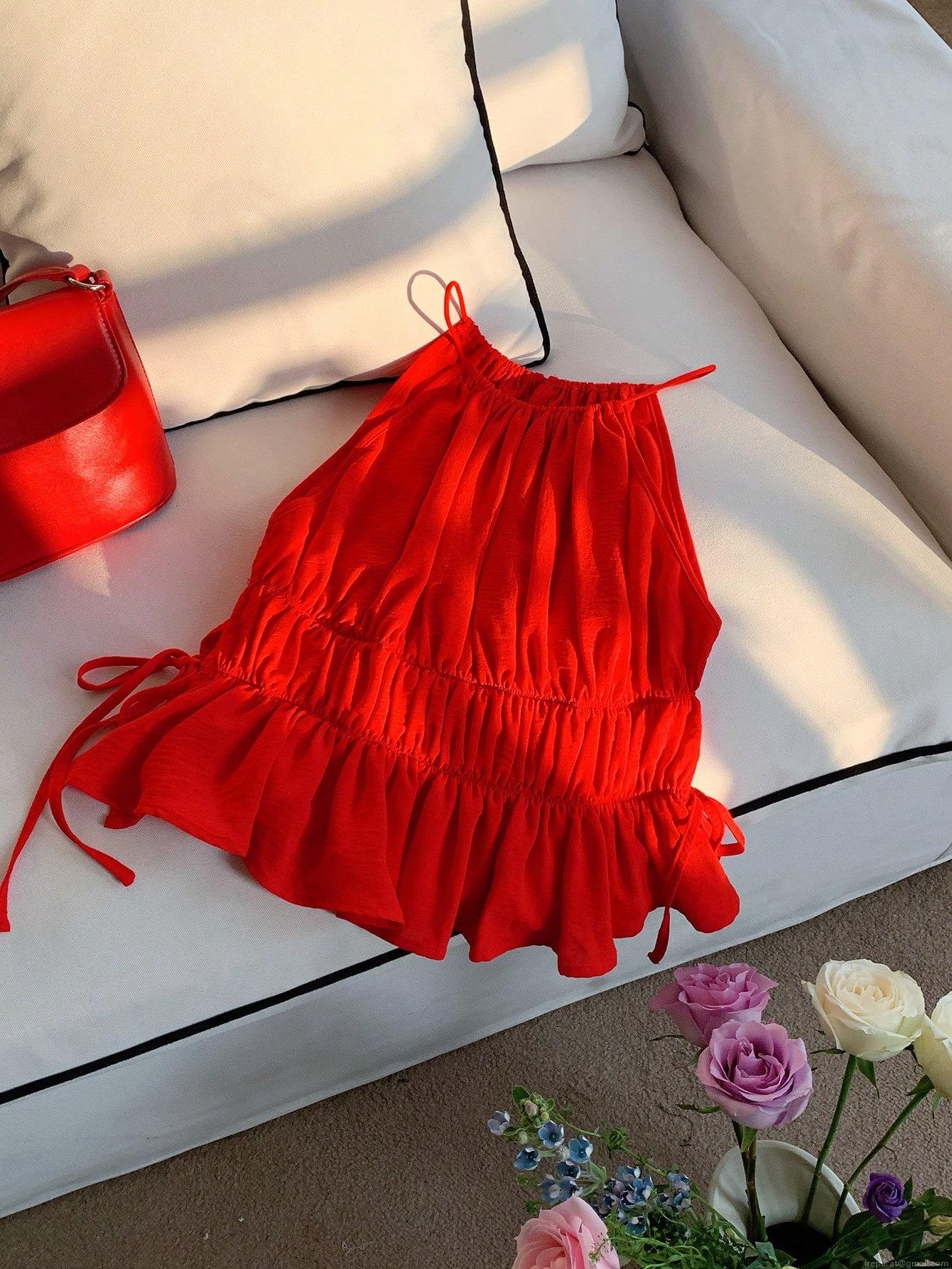 • Women Sexy Red Halter Smocked Camisole Backless Ruffle Hem Side Tie Pleated Summer Sleeveless Tank Top Party Vacation Clubwear