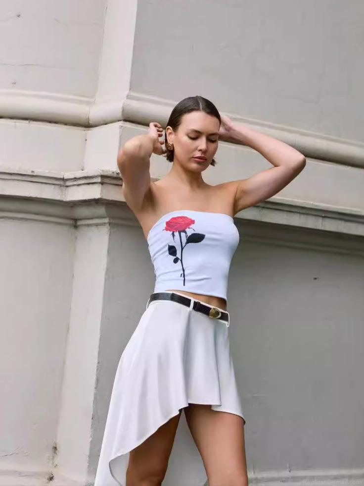 Women Sexy Rose Print Tube Top Strapless Polyester Elastane Milk Silk Blend Navel-Baring Slim Fit Short Camisole For Summer Party Streetwear