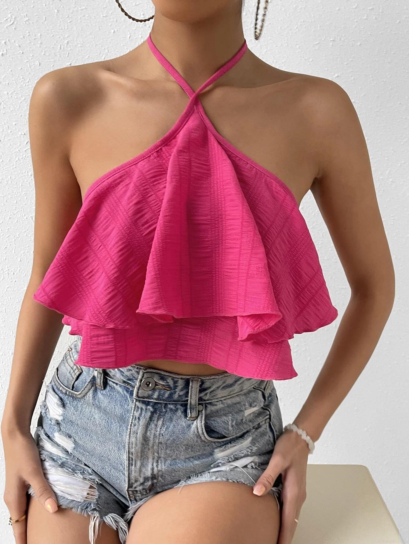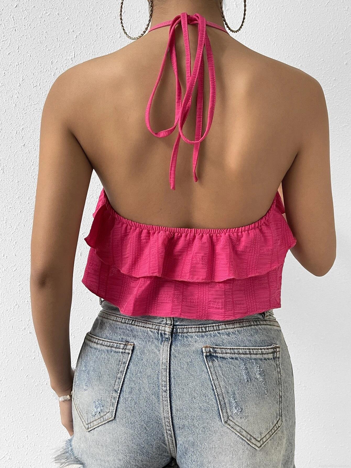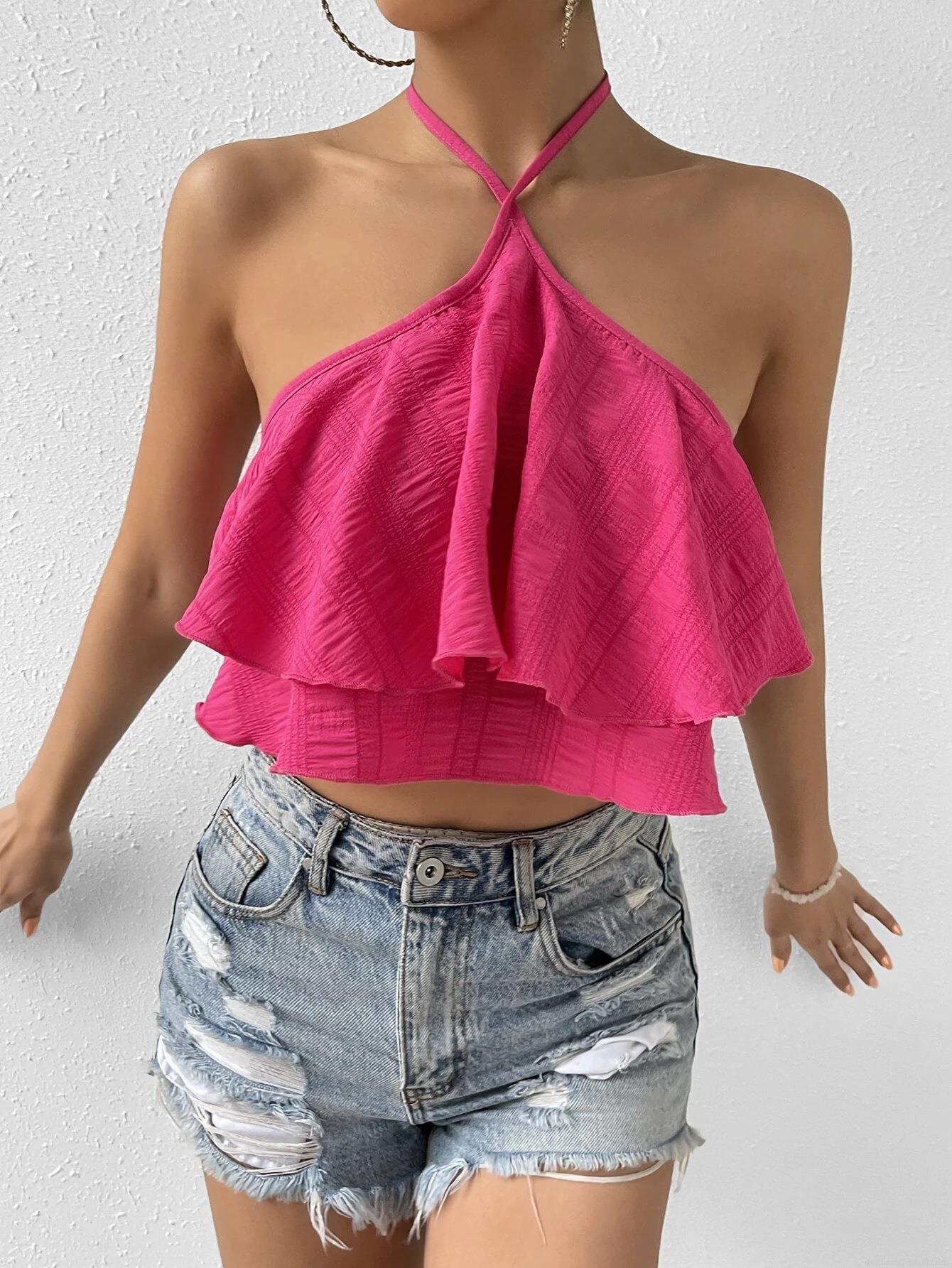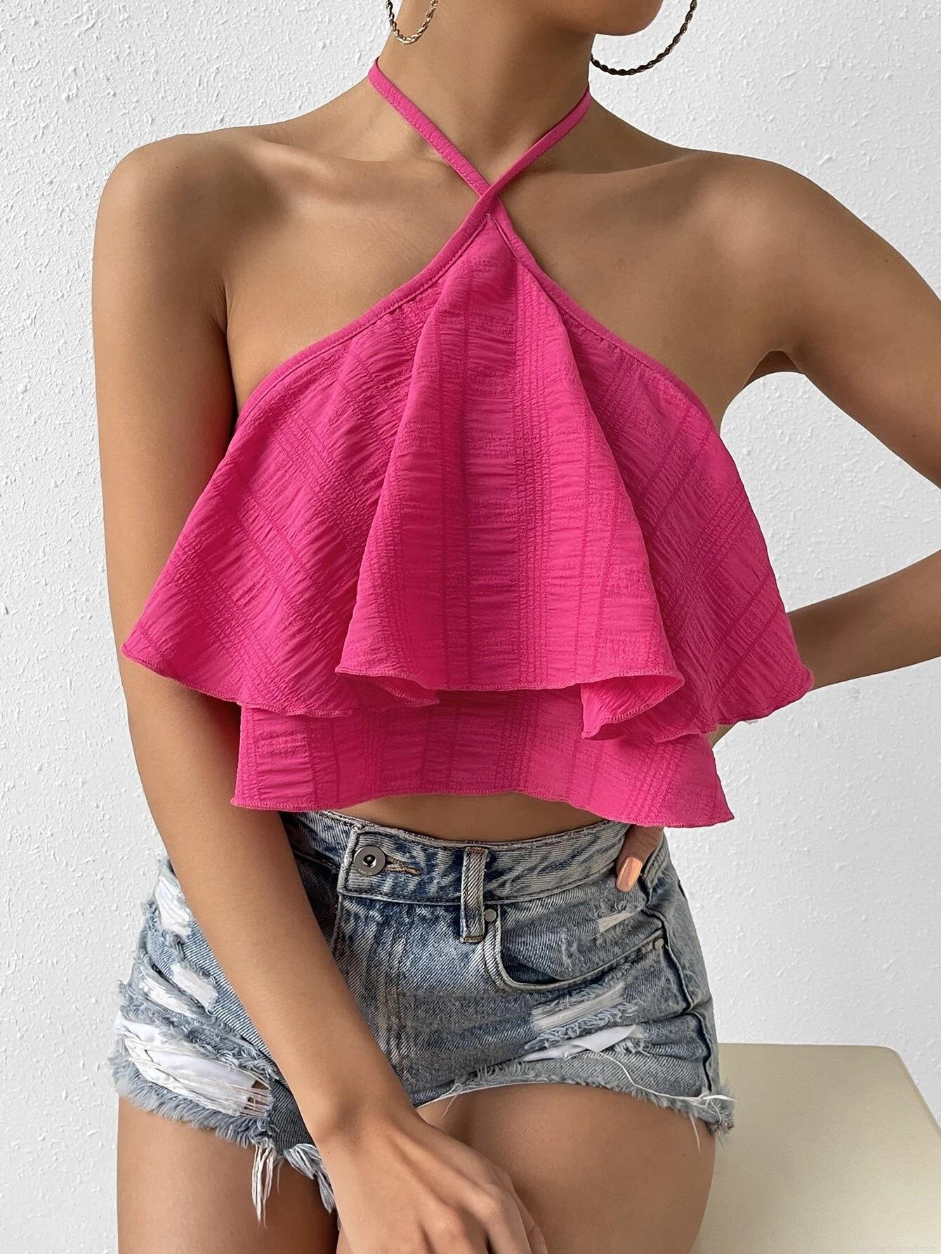 • Women Sexy Rose Red Halter Neck Backless Ruffle Tank Top Summer Y2K Tiered Pleated Sleeveless Crop Top For Party Clubwear Vacation Polyester Spandex Blend