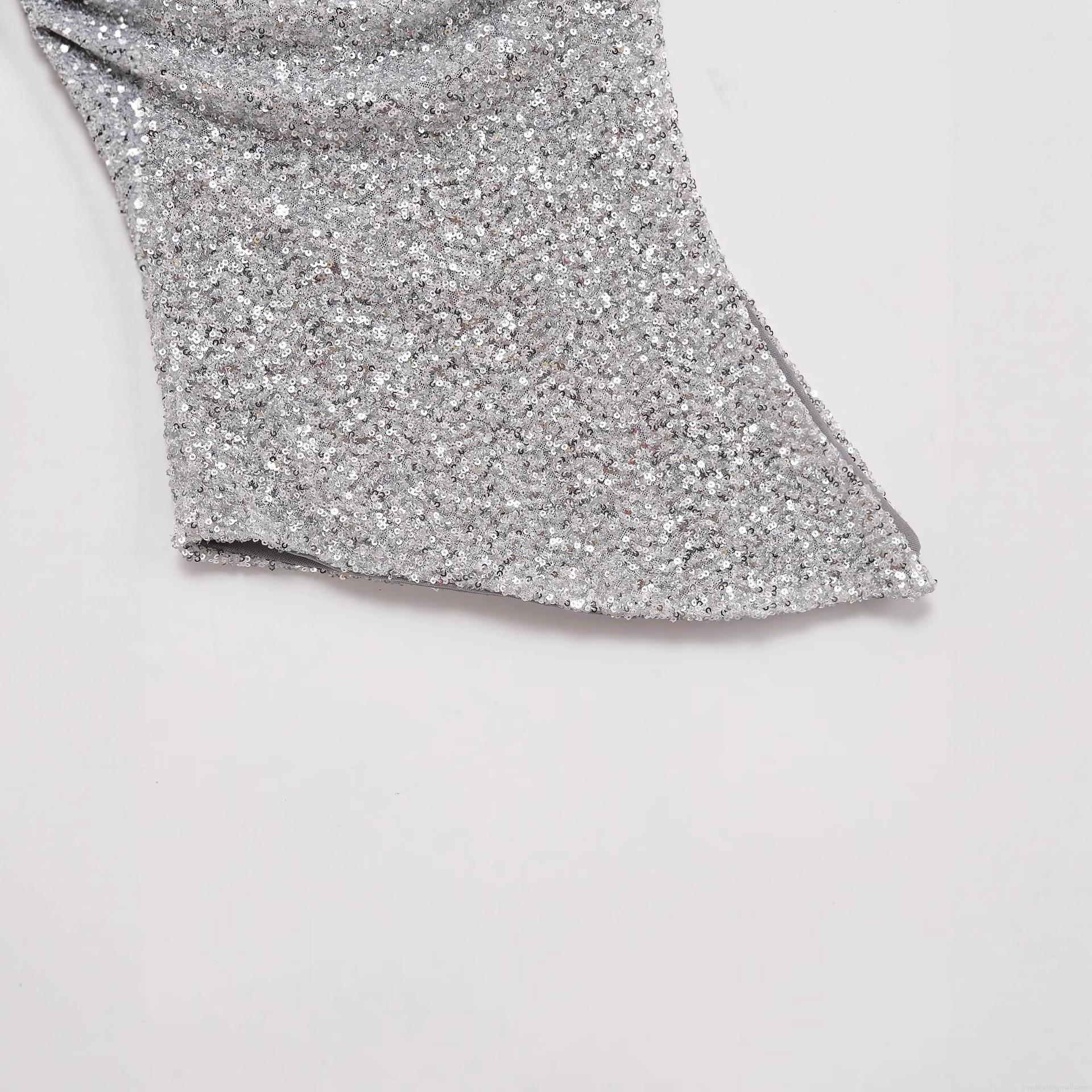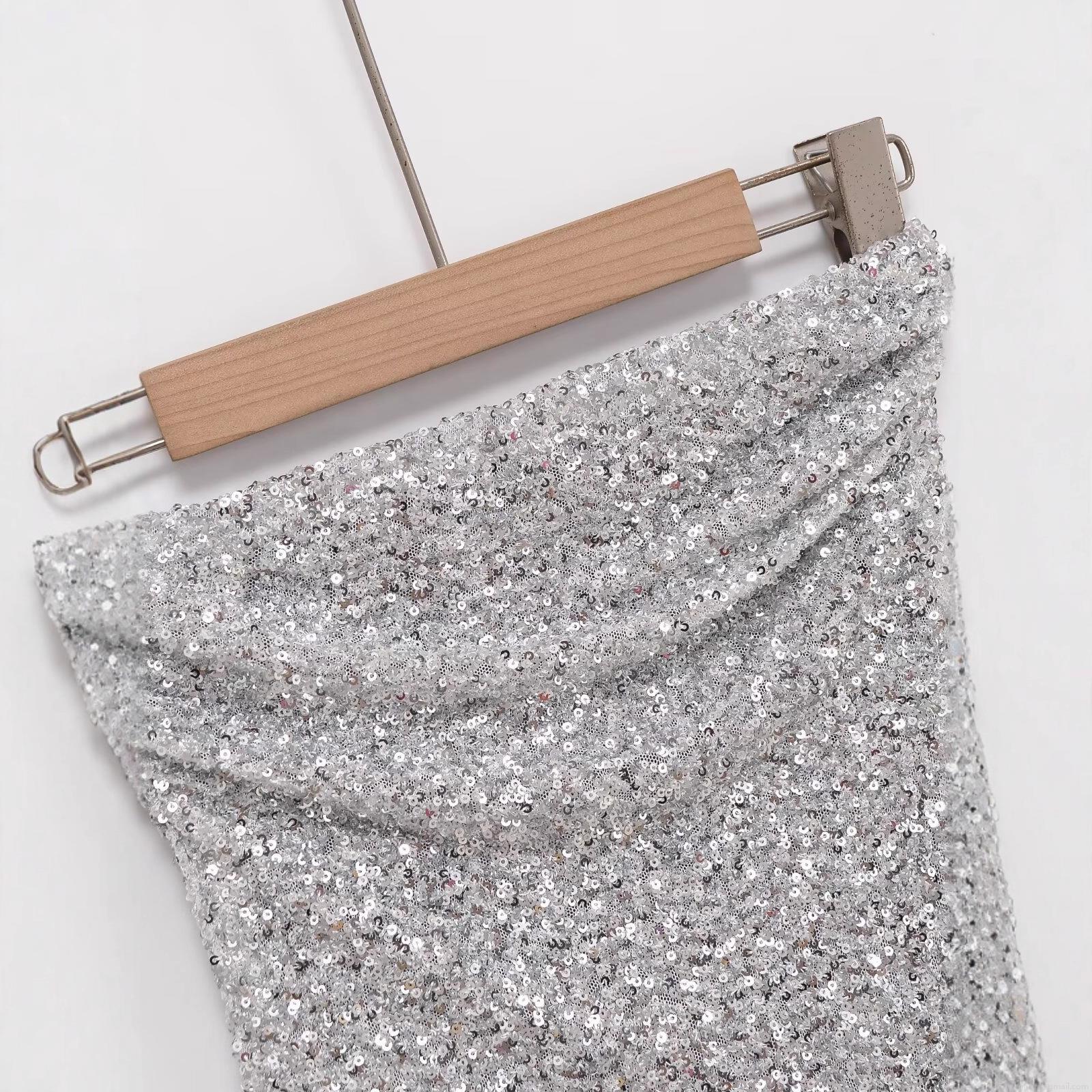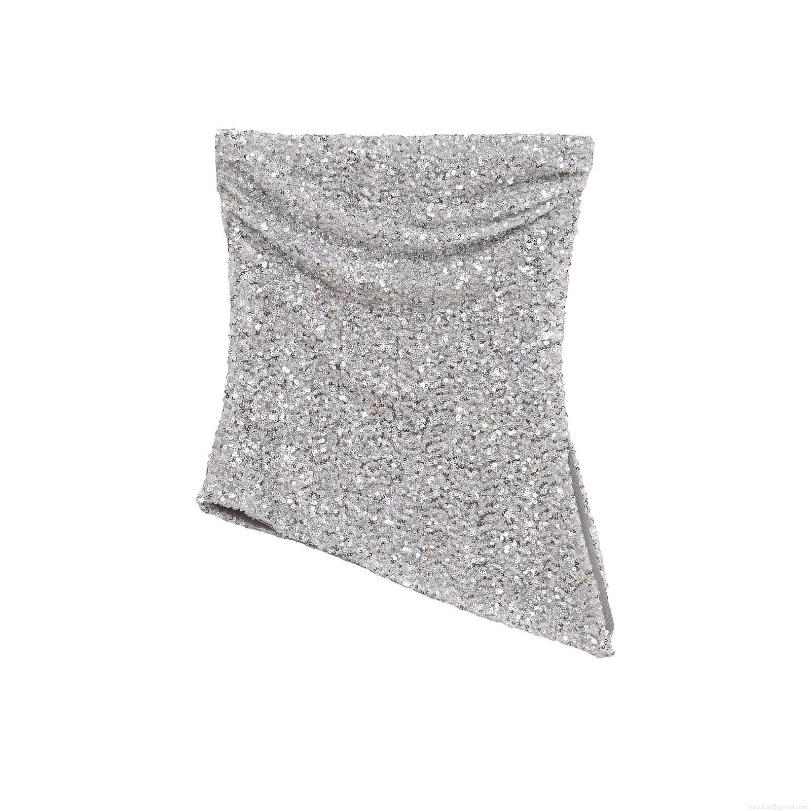 • Women Sexy Silver Sequin Tube Top Asymmetric Hem Strapless Polyester Sparkly Vest Top For Club Party Night Out Chic Streetwear