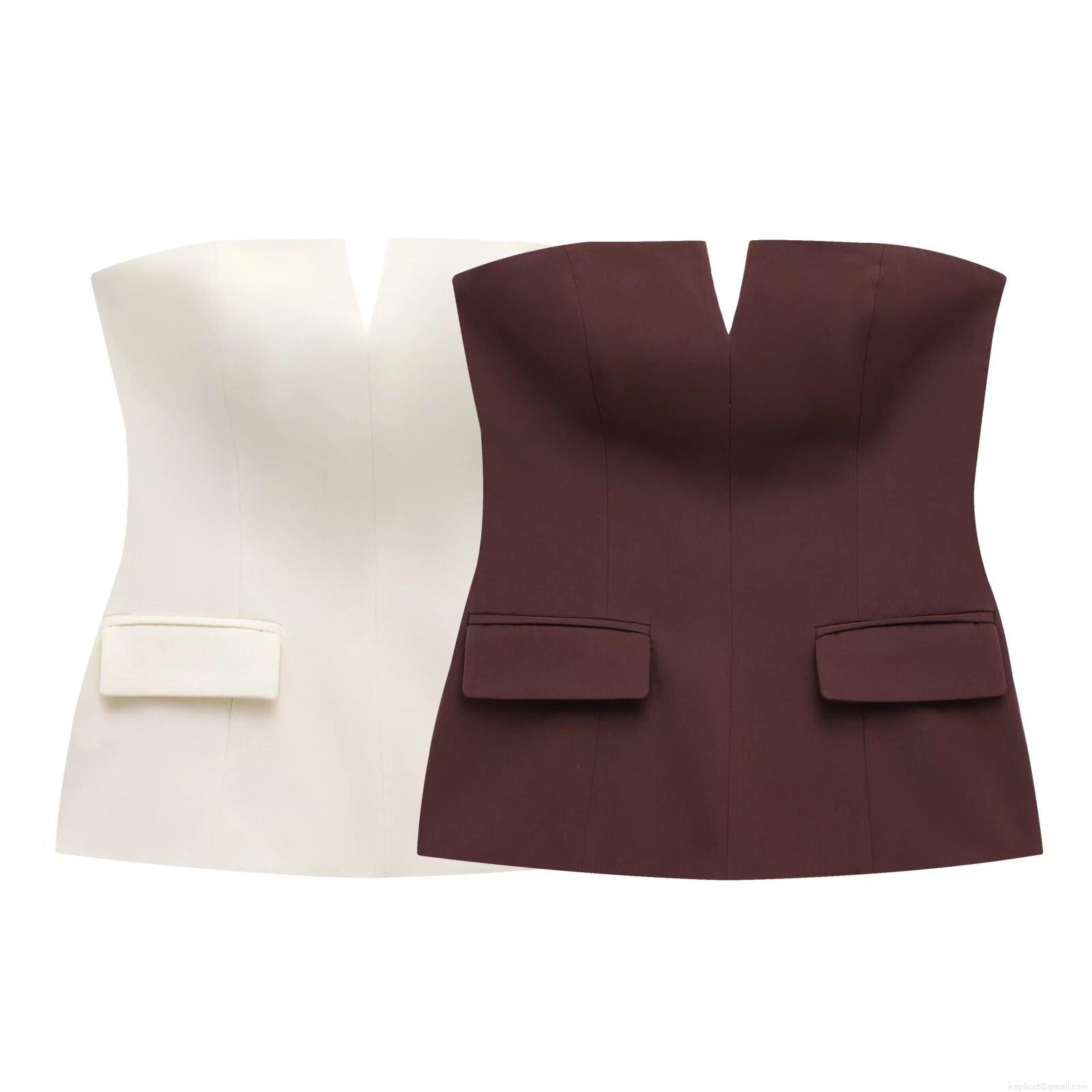 • Women Sexy Strapless Tube Top V-Neck Slim Fit Bandeau Top With Decorative Pockets Side Zipper Polyester Suit Fabric Sleeveless Vest For Party Clubwear