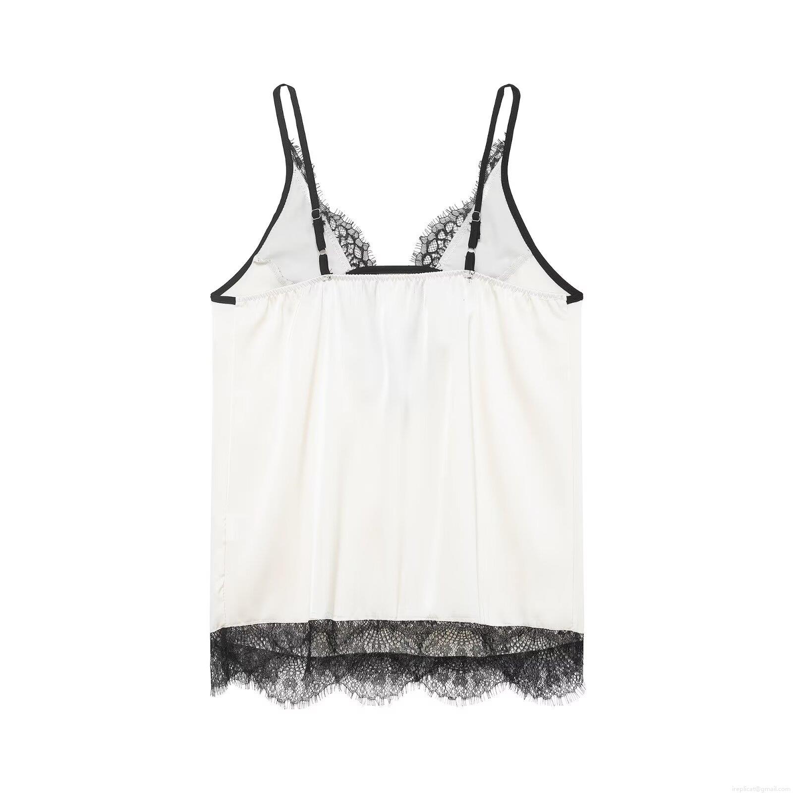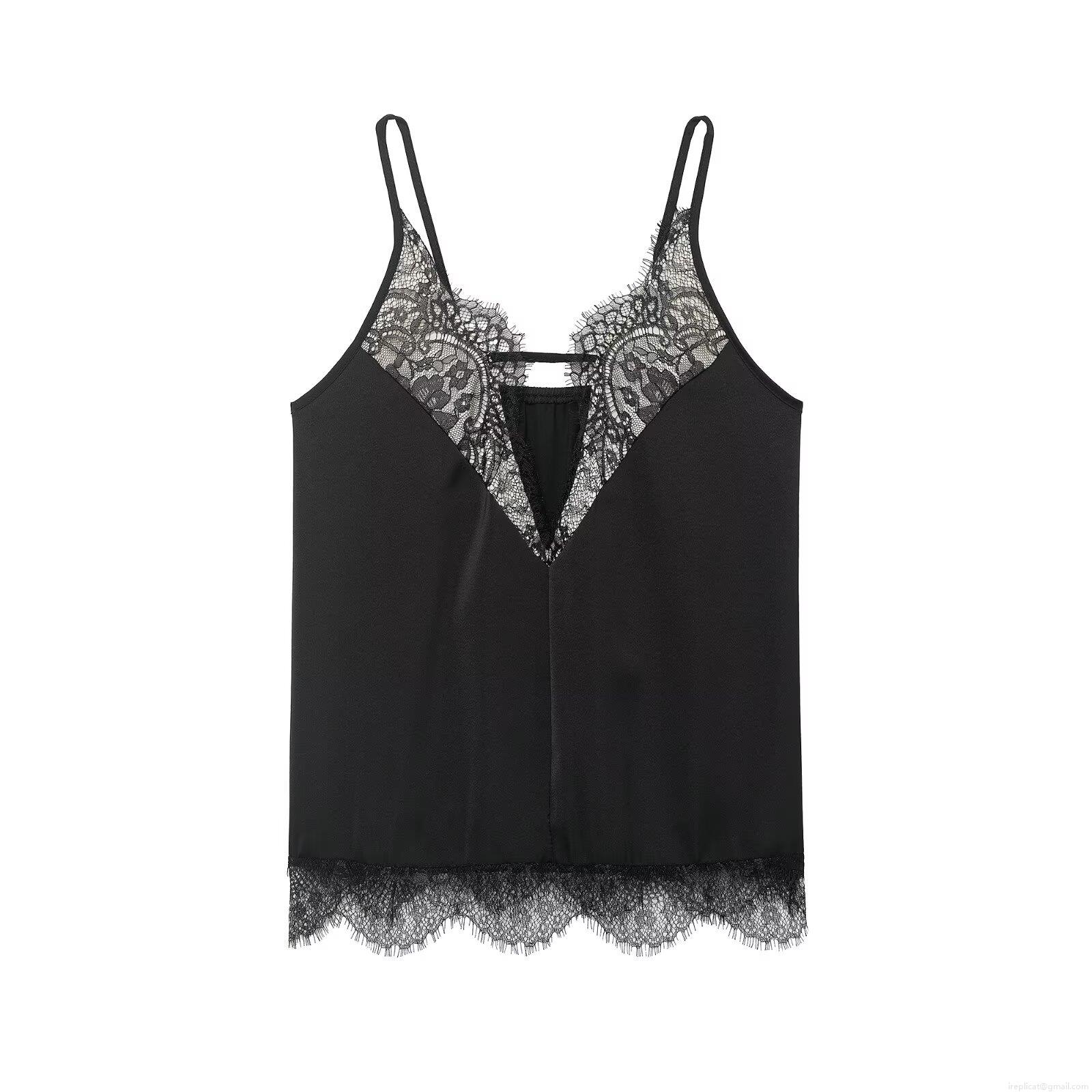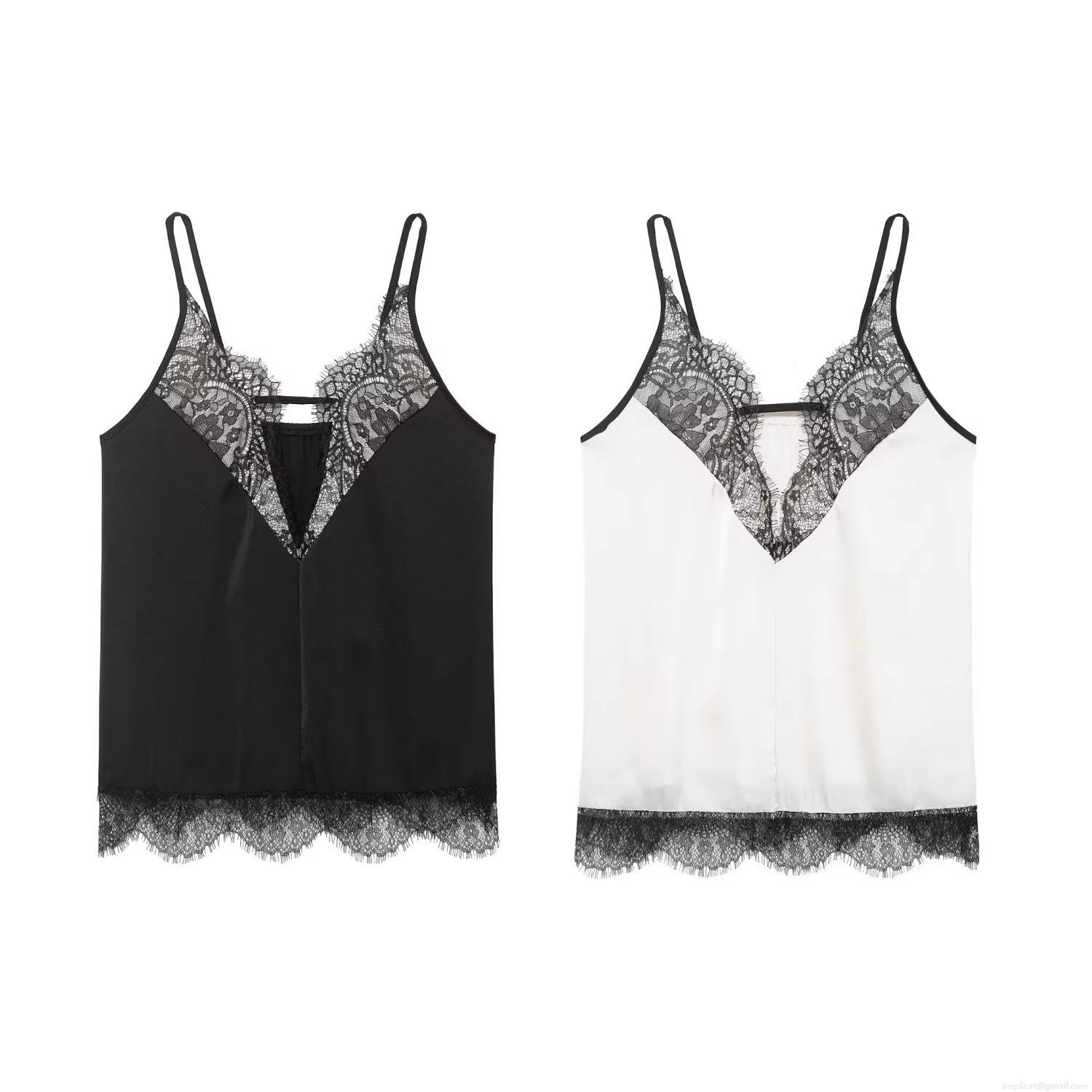 • Women Sexy Summer Satin Lace Camisole Deep V-Neck Spaghetti Strap Splicing Tank Top Elegant Sleeveless Vest For Daily Streetwear Party