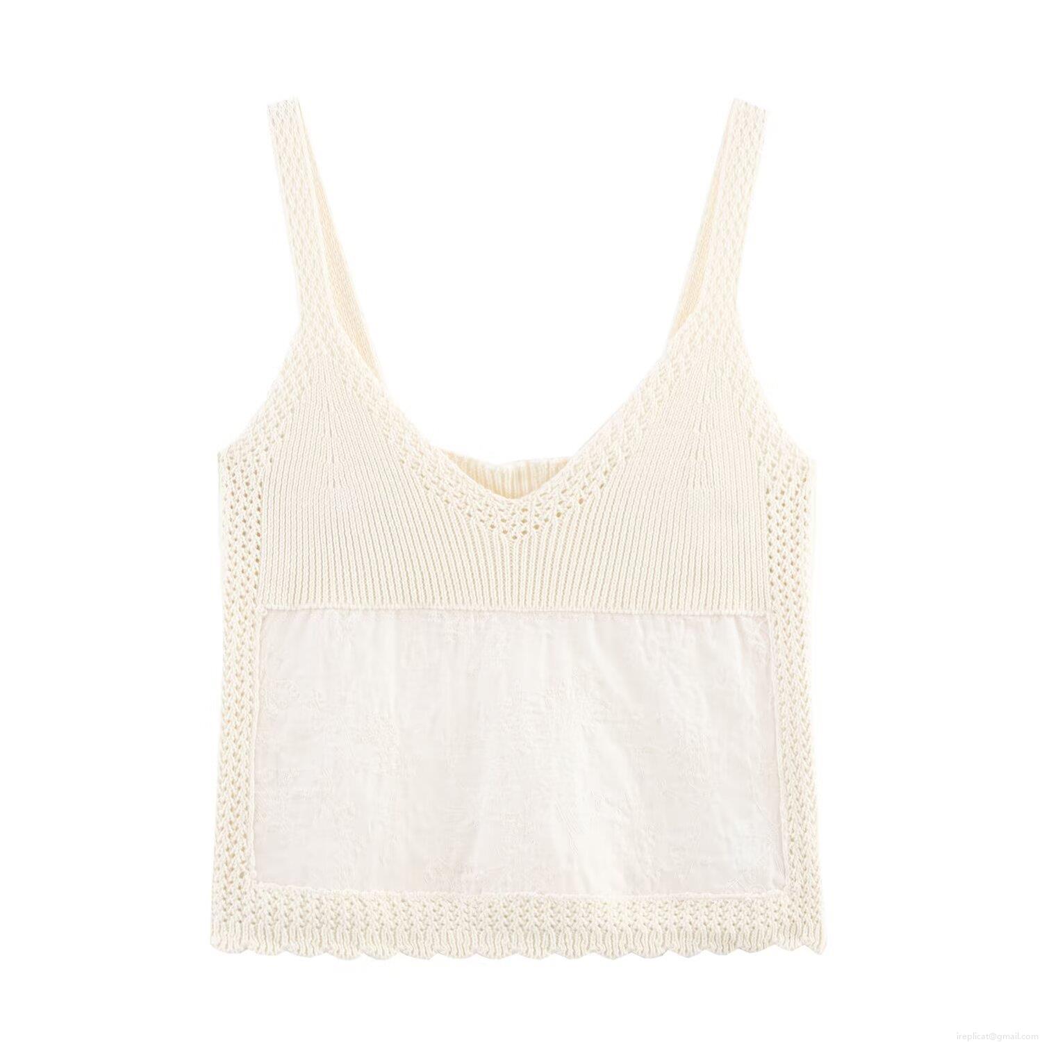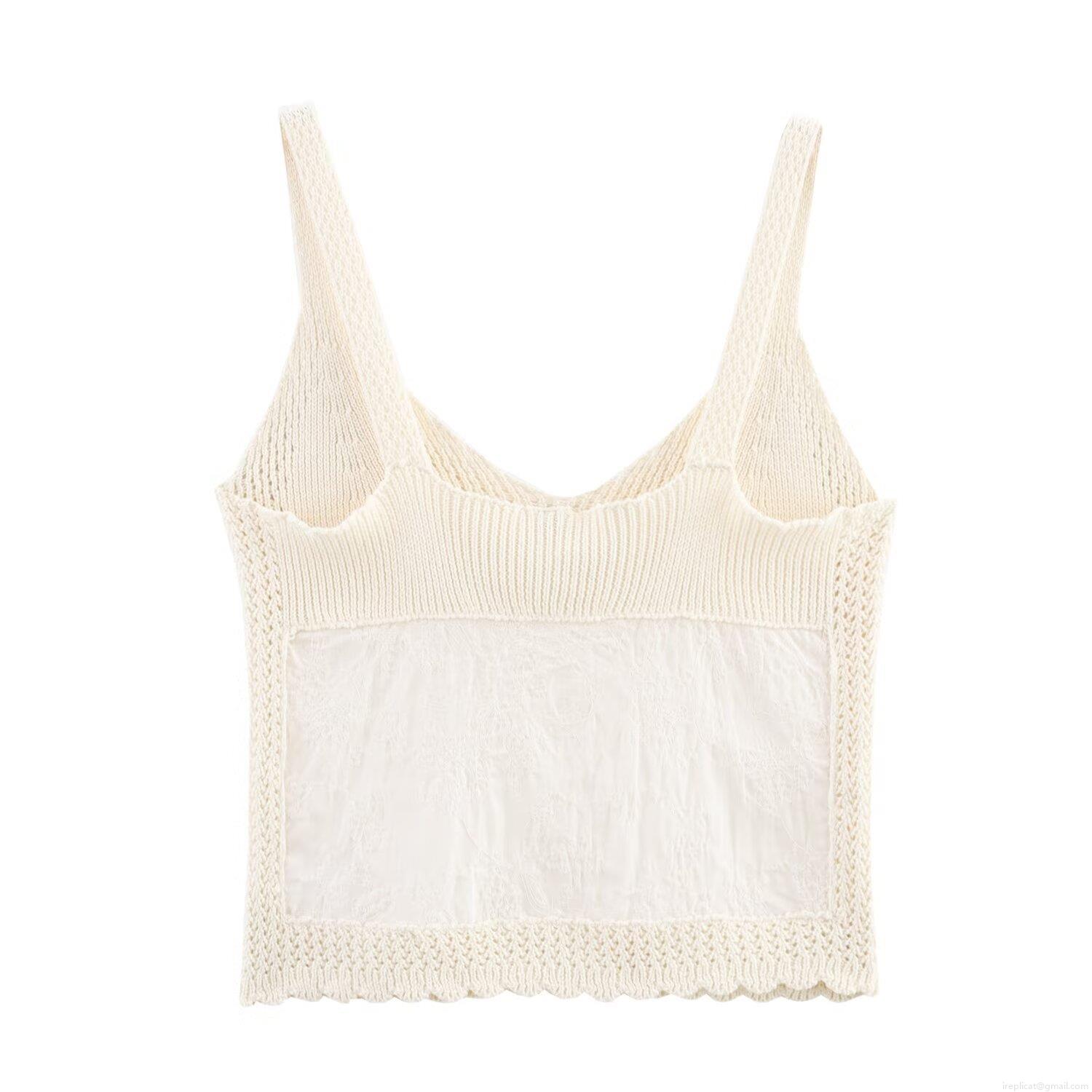 Women Sexy V Neck Knit Camisole Summer Lace Patchwork Backless Sleeveless Tank Top Beige Crochet Short Streetwear Vest