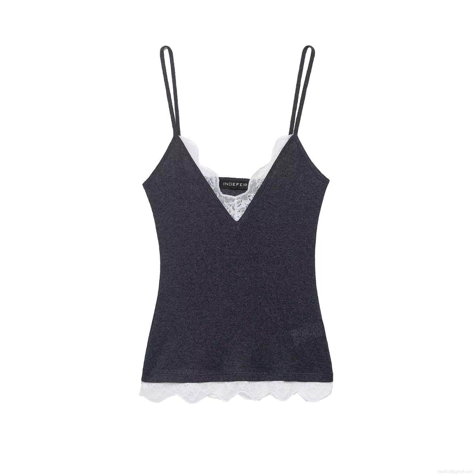 • Women Sexy V Neck Lace Patchwork Camisole Top Ribbed Knit Slim Fit Tank Top For Daily Streetwear Sleeveless Solid Color Basic Inner Wear Camis Top