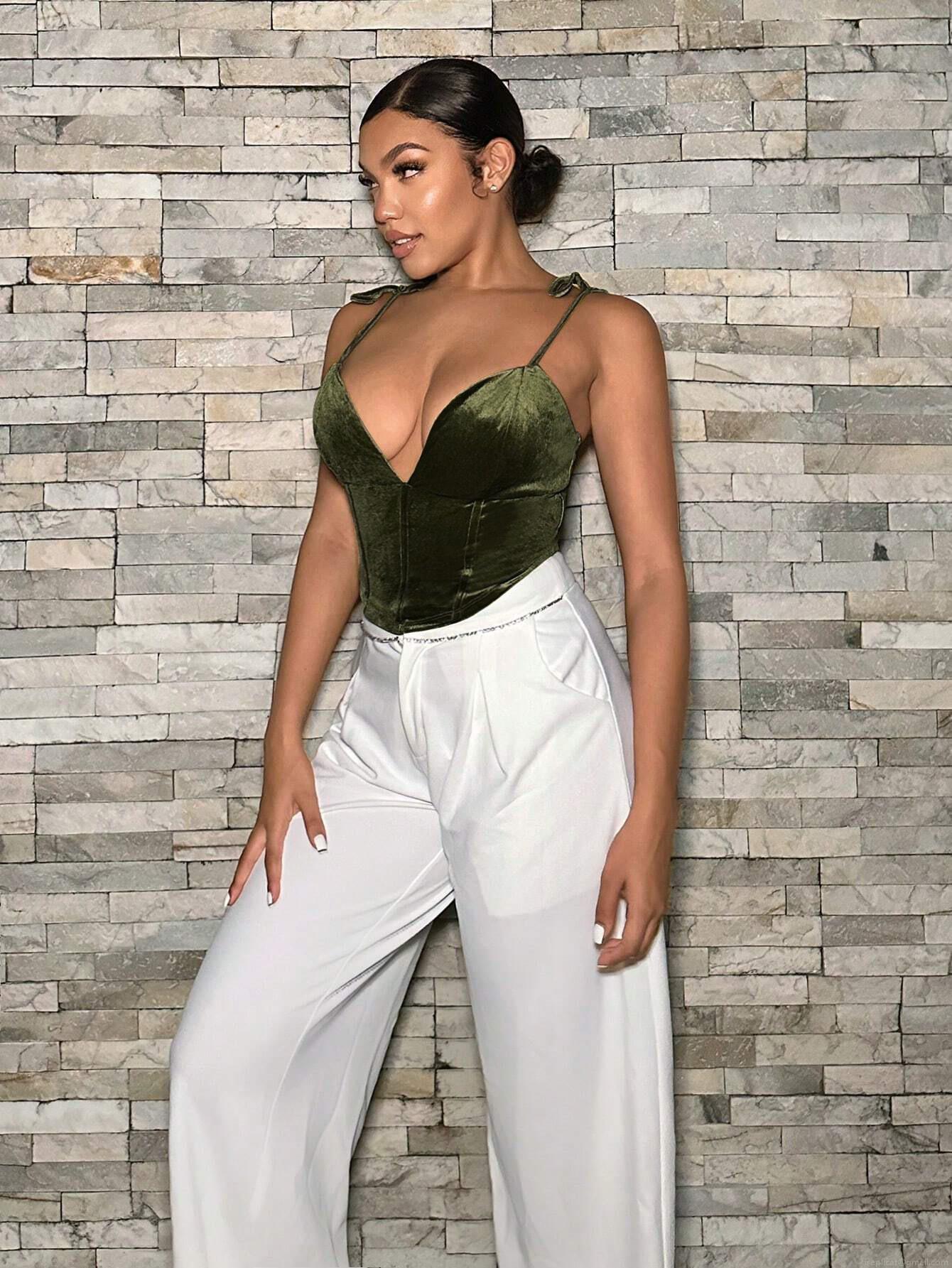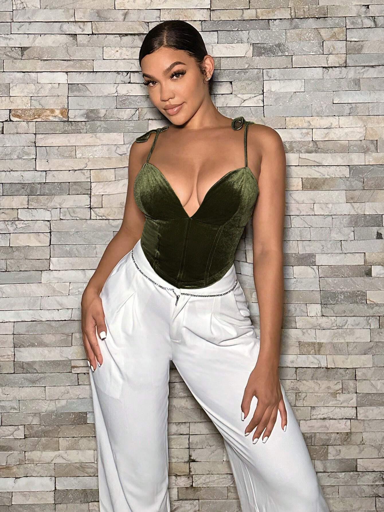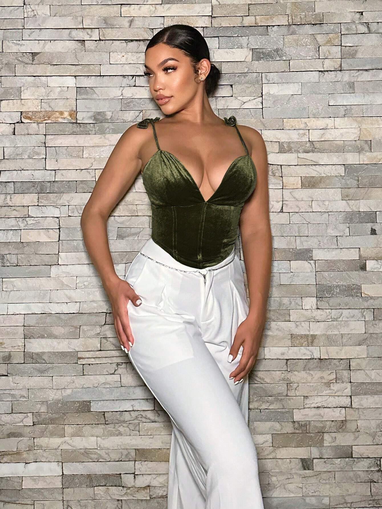• Women Sexy Velvet Deep V Neck Camisole Asymmetrical Fishbone Corset Tank Top Slim Fit 95% Polyester 5% Elastane Bow Shoulder Strap Club Party Y2K Crop Top