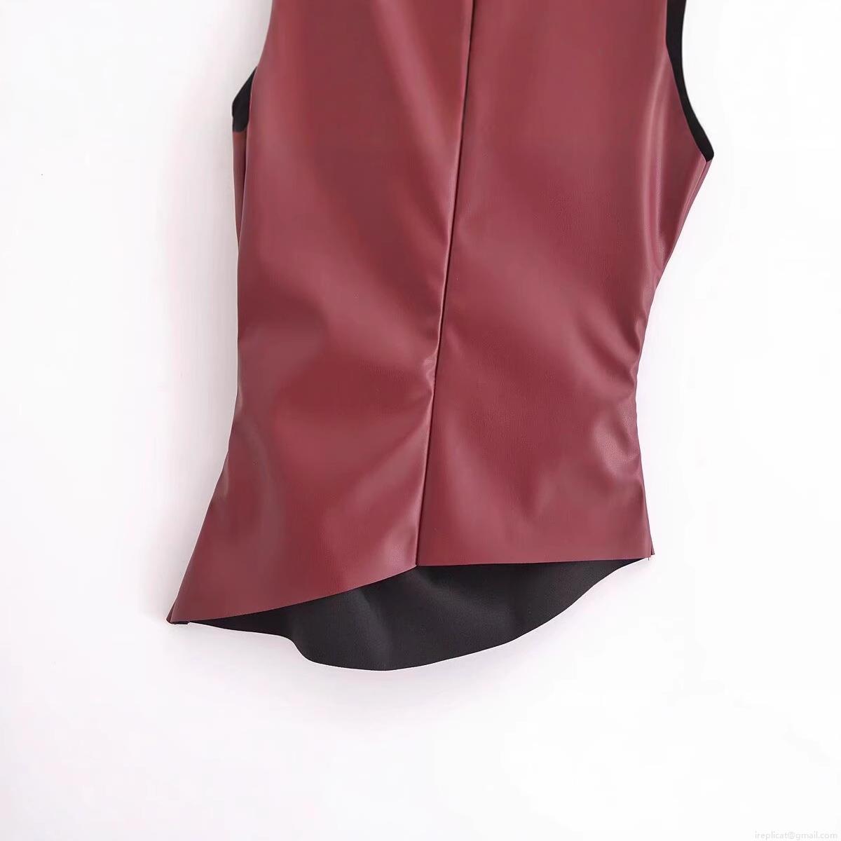 • Women Sexy Wine Red Faux Leather Sleeveless Tank Top Cowl Neck Irregular Hem Back Zipper Pleated PU Slim Fit Vest Party Clubwear
