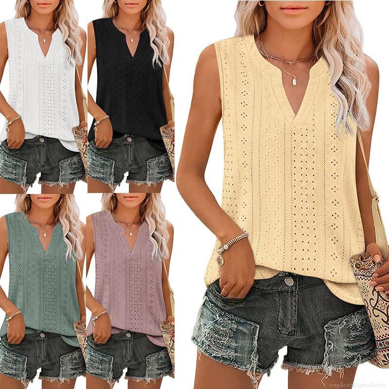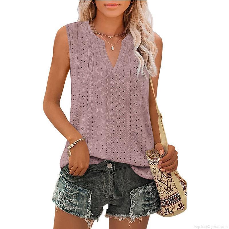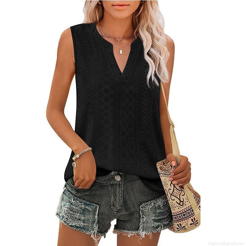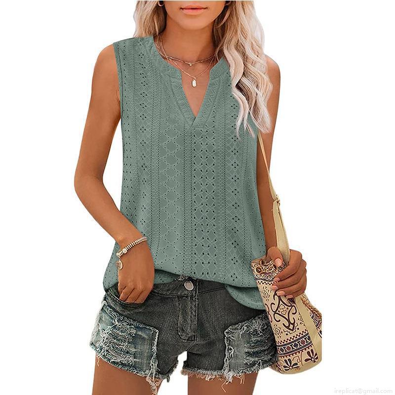 • Women Sleeveless V Neck Tank Top 95% Polyester 5% Spandex Hollow Out Eyelet Embroidery Summer Casual Loose Vest For Women