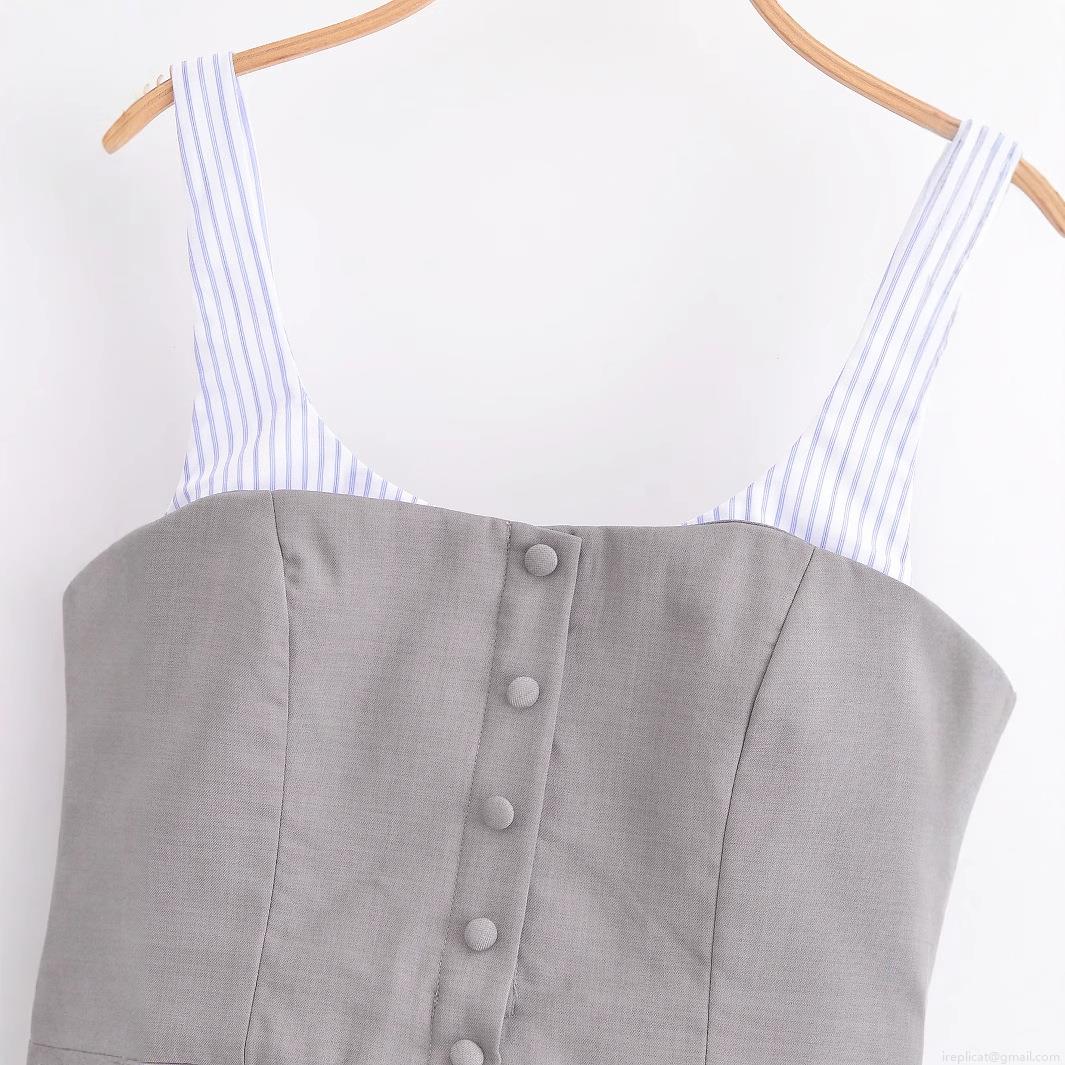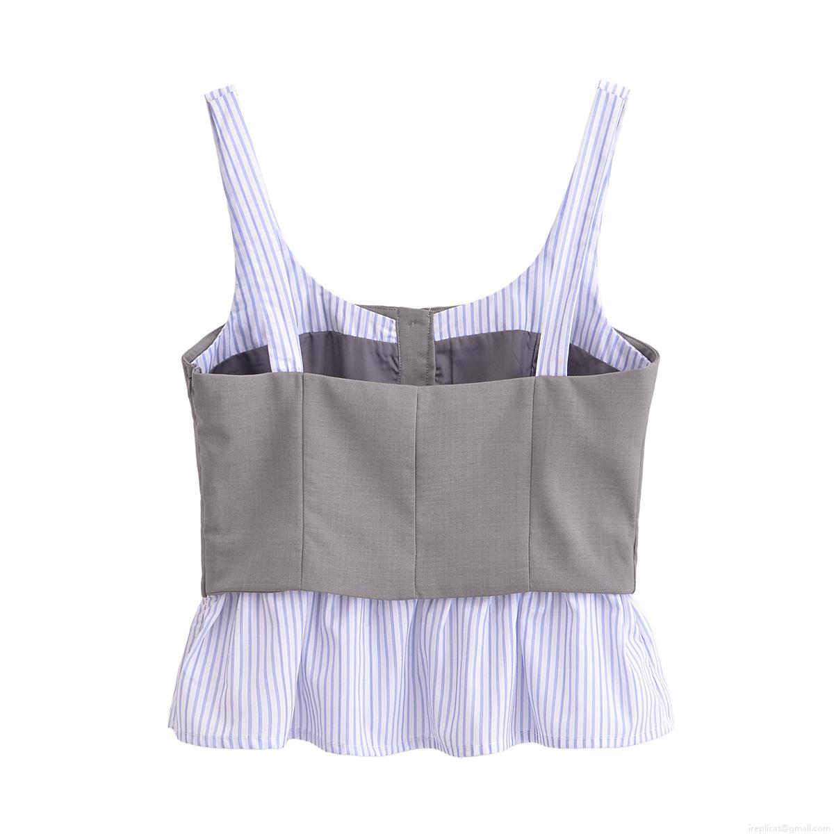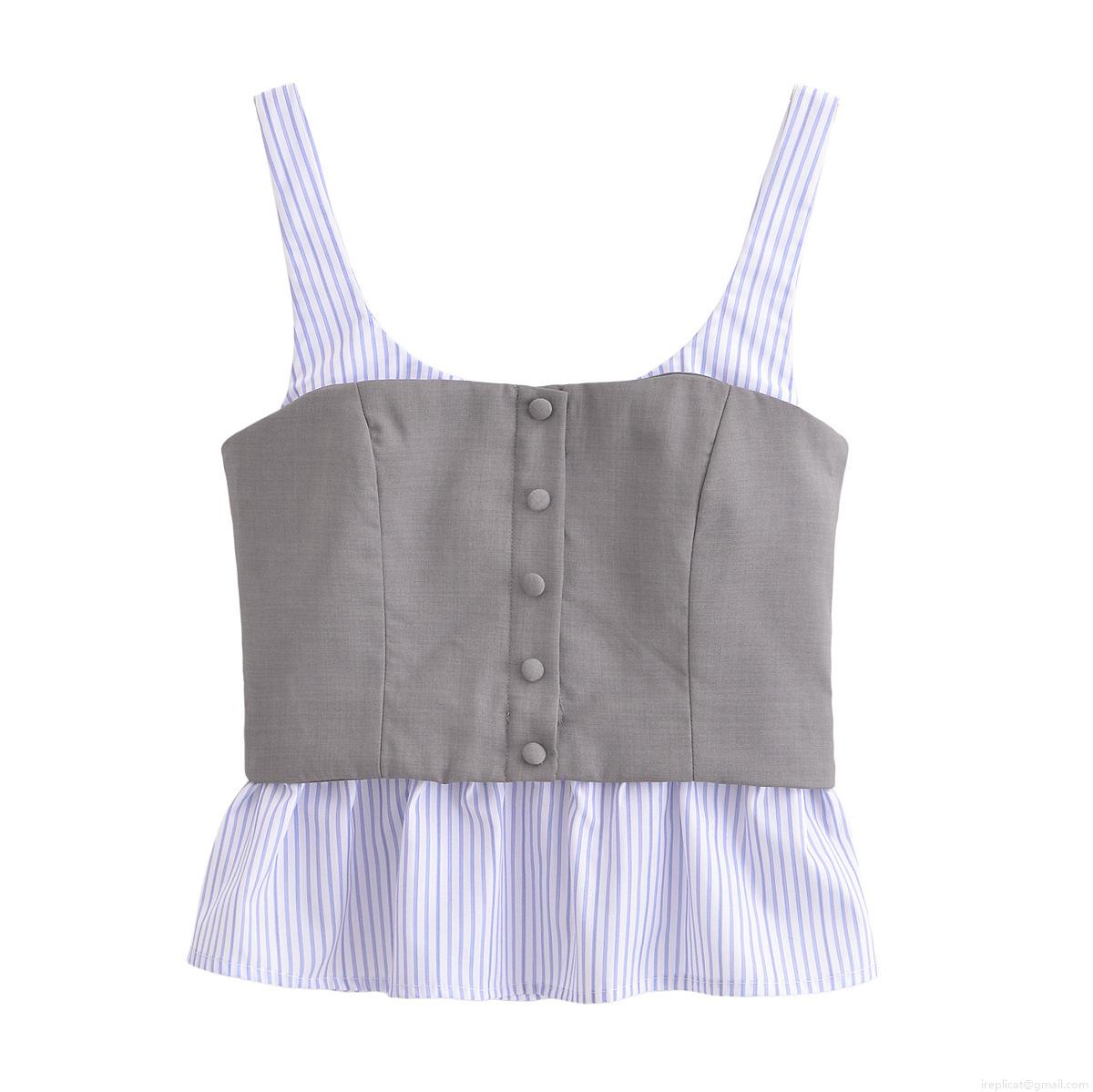 Women Striped Patchwork Camisole Top Polyester Grey Blue White Spaghetti Strap Corset Style Button Front Ruffle Hem Casual Streetwear Tank Top
