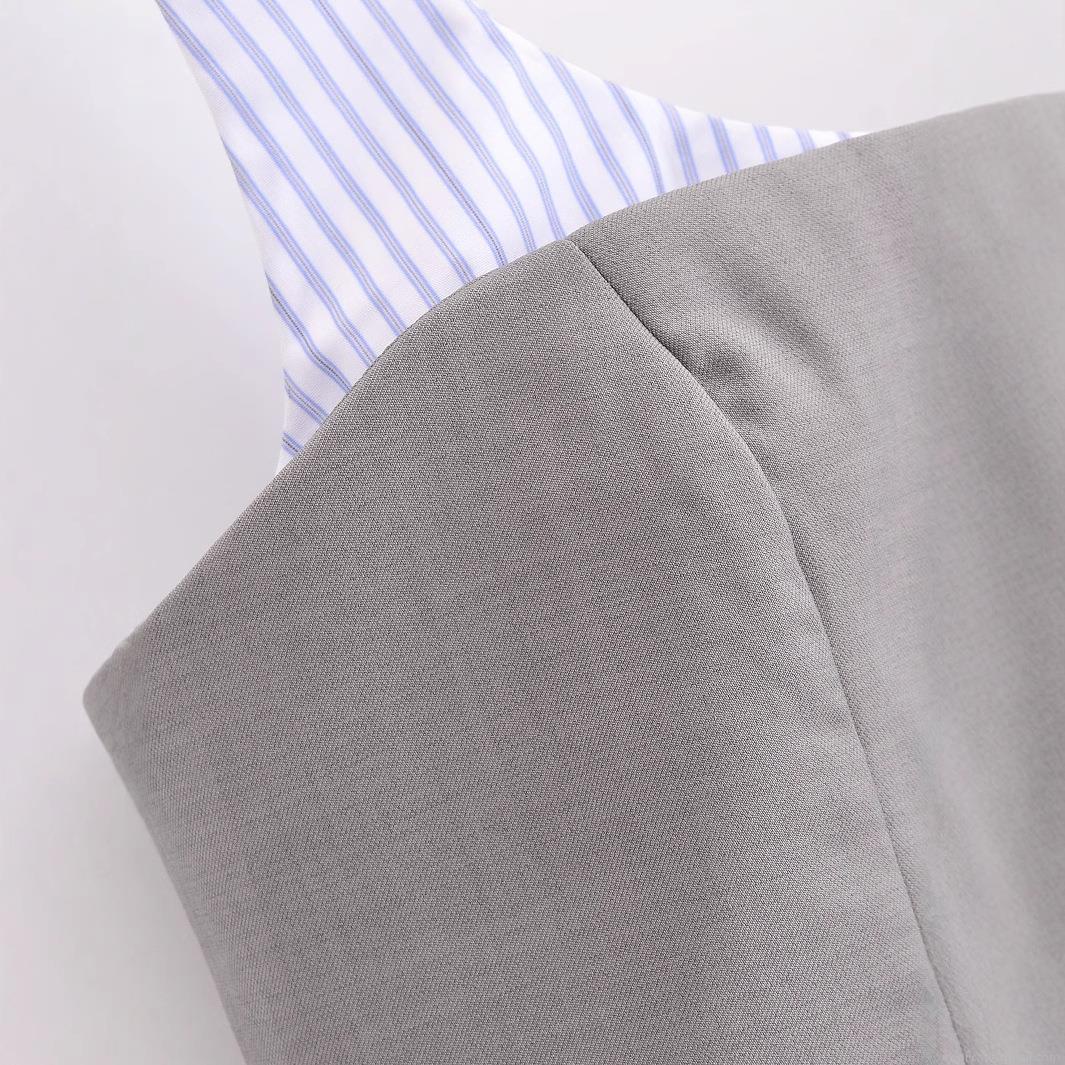 Single-breasted Buckle, Grey Corset-style Fitted Waist Panel, Striped Ruffle Hem