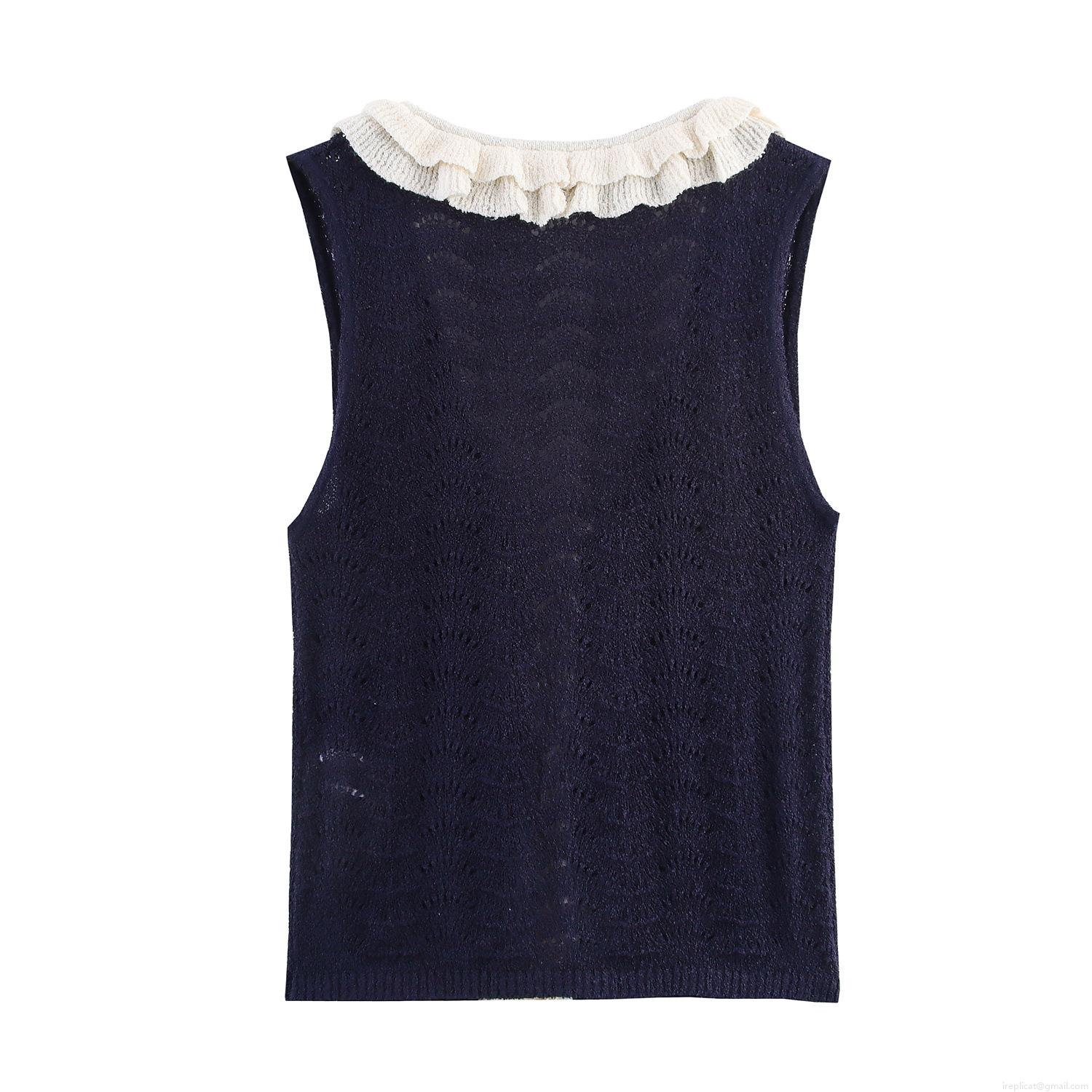 Women Sweet Knitted Vest Top V Neck Tie Front Hollow Out Sleeveless Knitwear With Lace Ruffle Decor French Vintage Deep Blue Slim Fit Camisole For Daily Dating