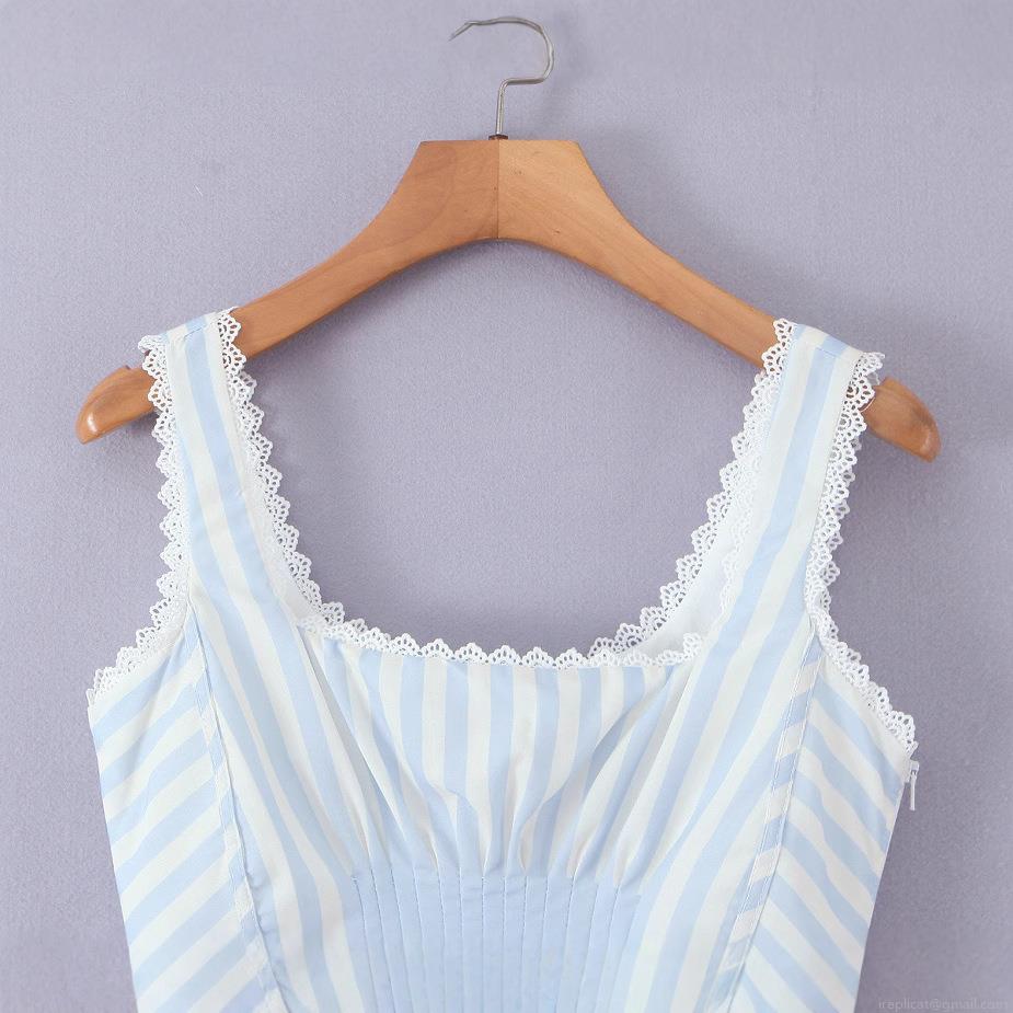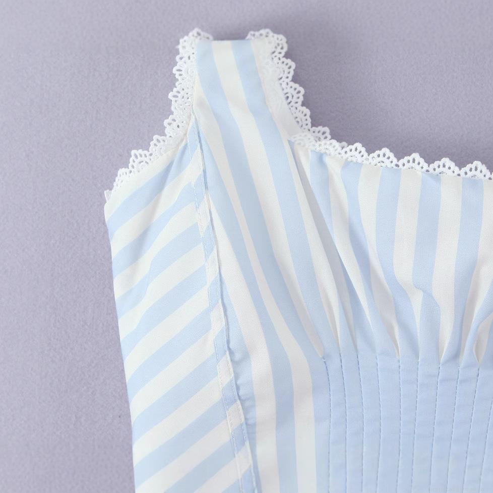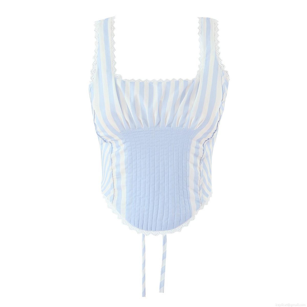 • Women Vintage Blue White Striped Cami Top Cotton Polyester Slim Fit Tank Top With Lace Trim Back Lacing Pleated Bust Summer Sleeveless Crop Top For Women