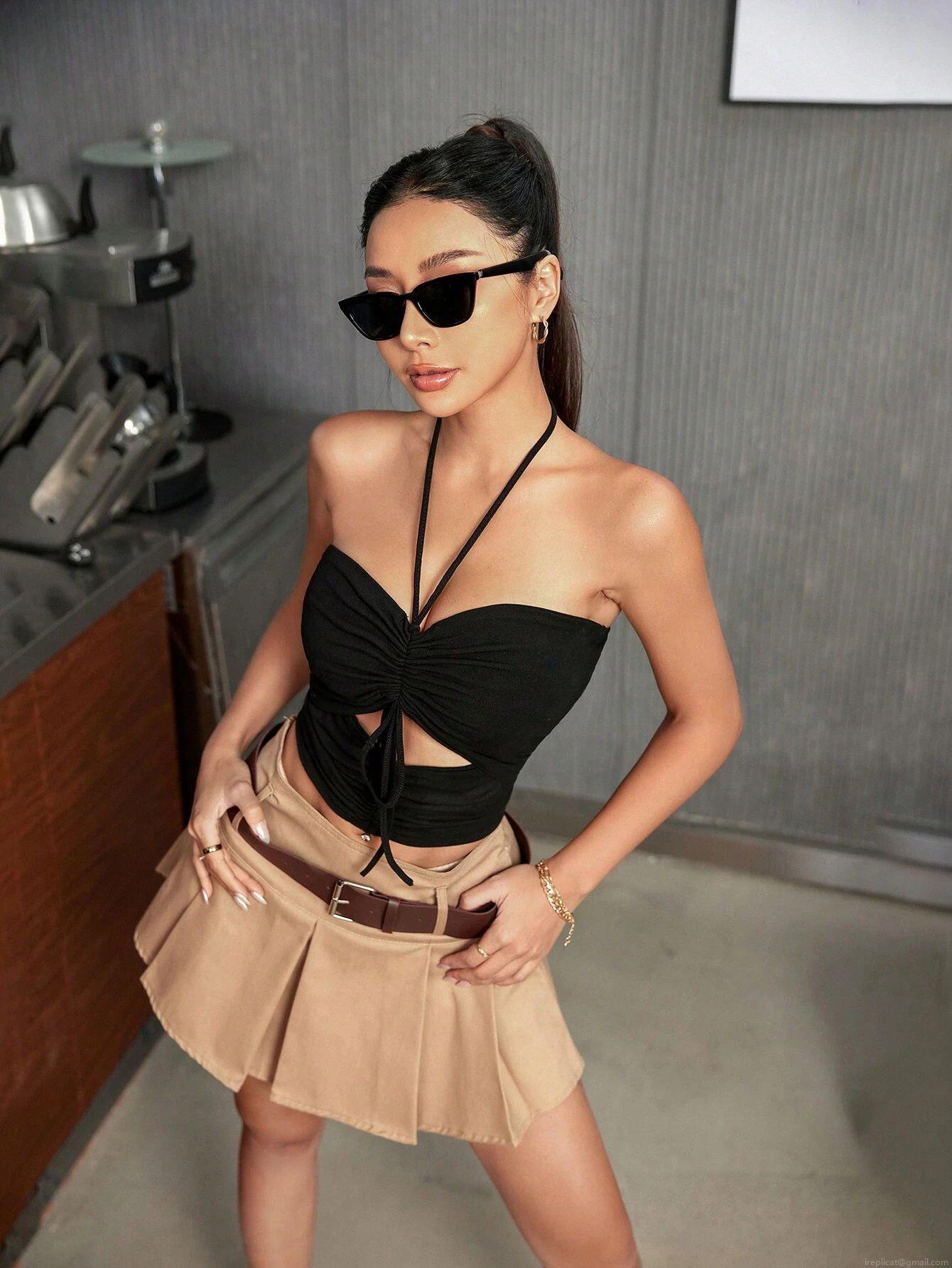 • Women's Black Halter Neck Crop Top 95% Polyester 5% Spandex Ruched Cutout Backless Camisole For Summer Streetwear Daily Wear Sexy Slim Fit Tank Top