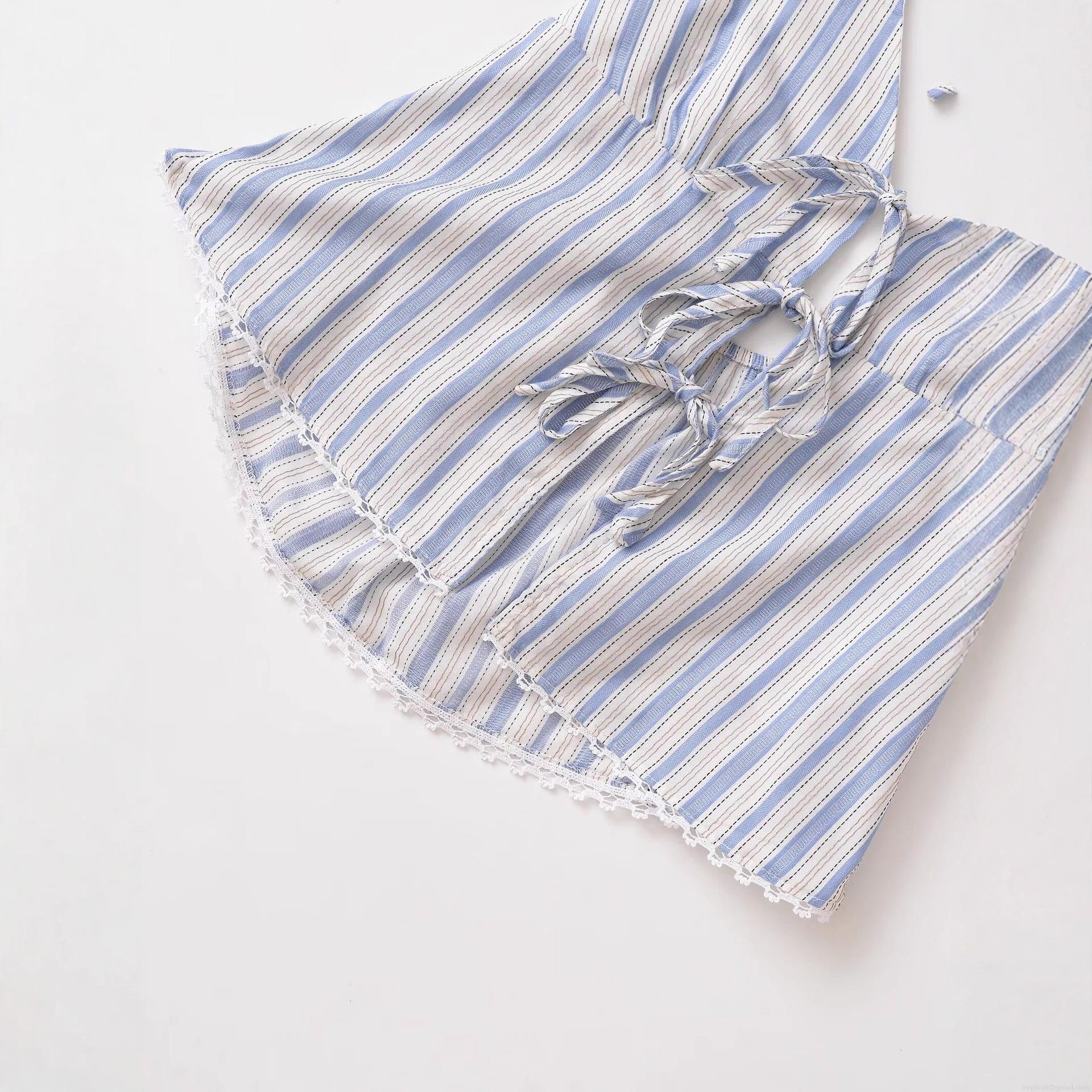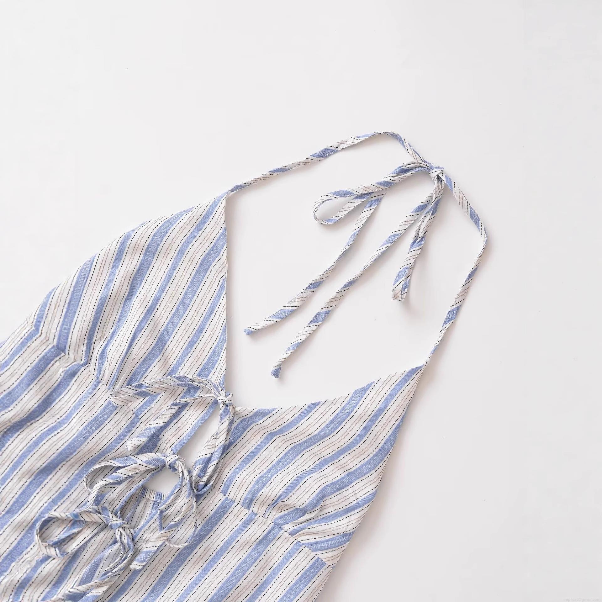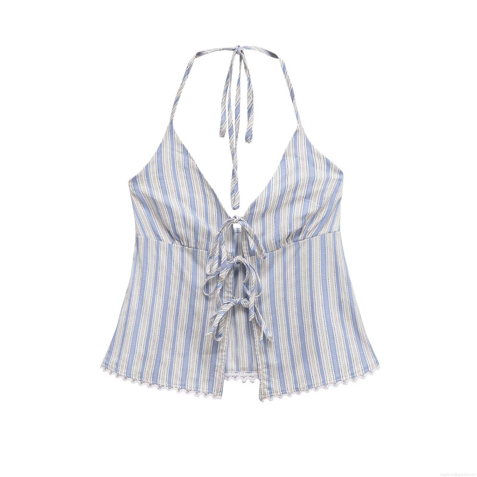 • Women's Blue White Striped Halter Top With Lace Trim Bow Front Sexy Backless Camisole For Summer Vacation Sleeveless Polyester Tank Top