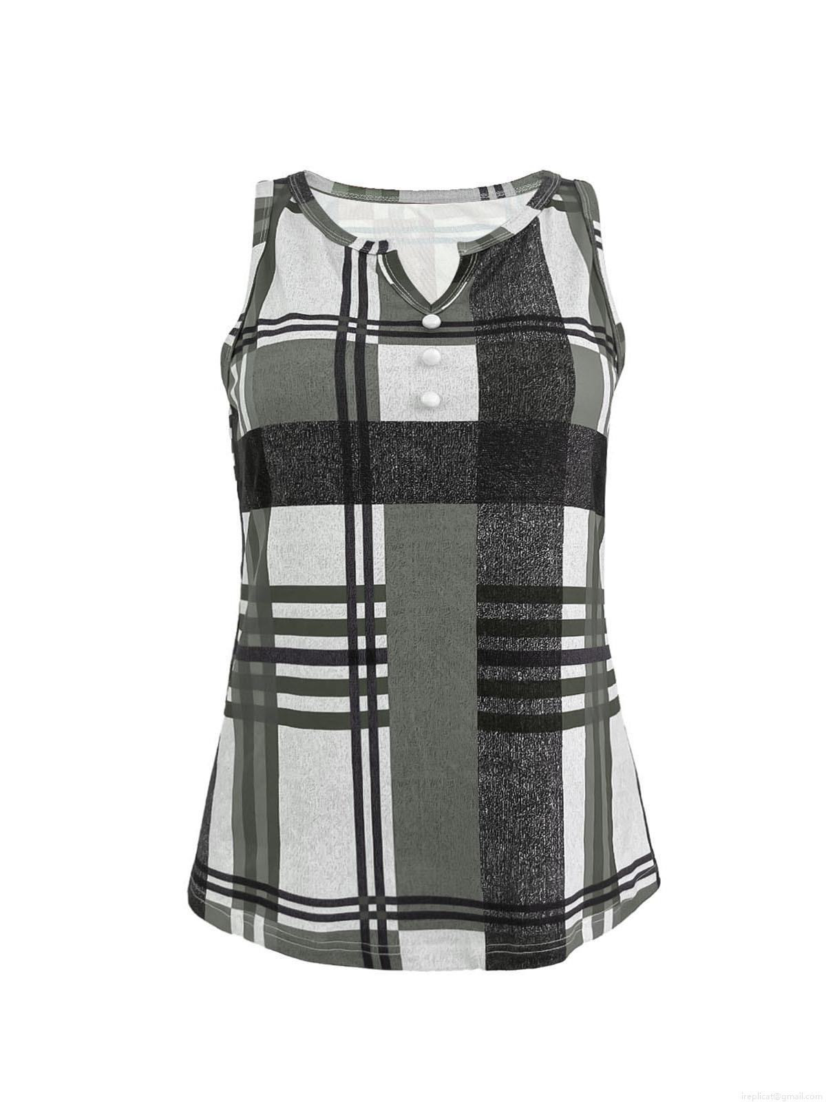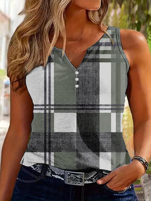 • Women's Casual Plaid V-Neck Tank Top Sleeveless Polyester Spandex Checked Blouse With Decorative Buttons Summer Fashion Sleeveless Shirt For Daily Vacation Women