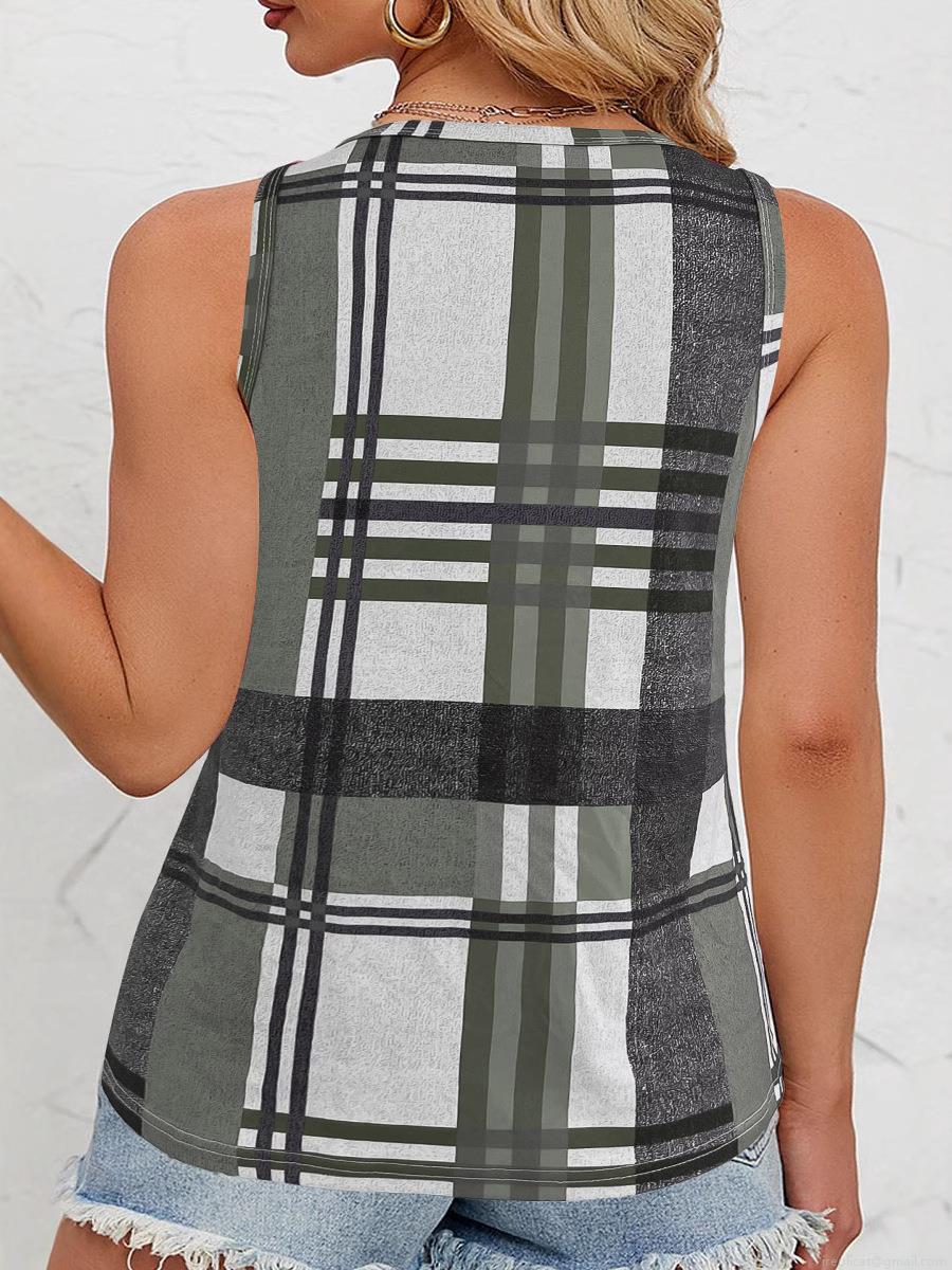 Women's Casual Plaid V-Neck Tank Top Sleeveless Polyester Spandex Checked Blouse With Decorative Buttons Summer Fashion Sleeveless Shirt For Daily Vacation Women