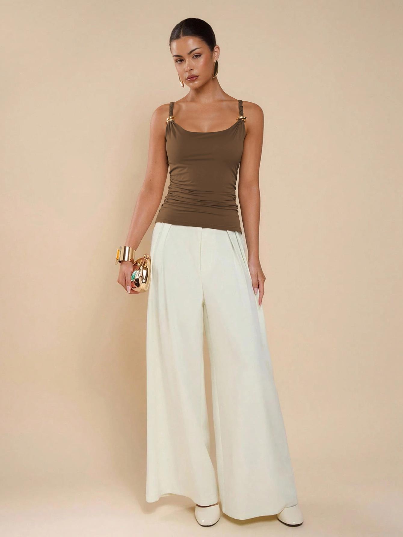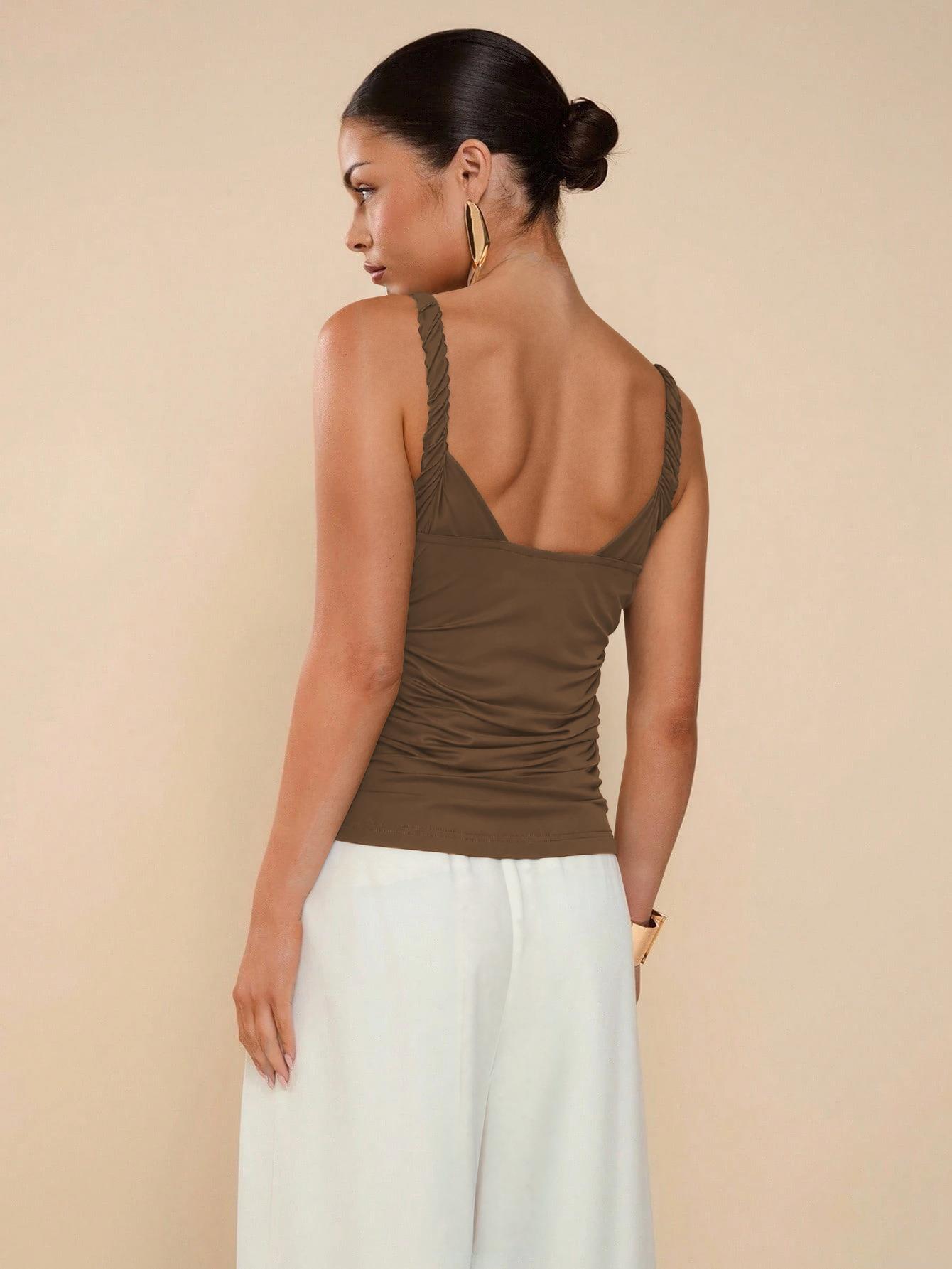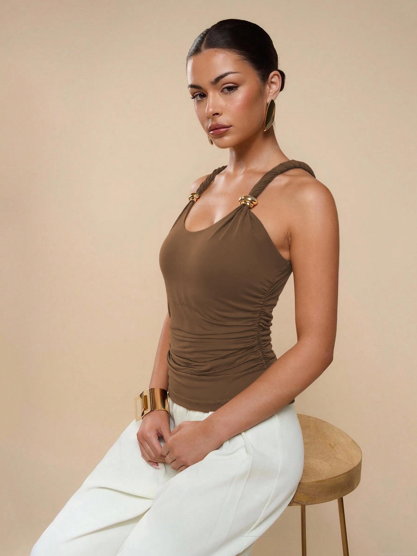 • Women's Chic Slim Fit Brown Tank Top With Gold Metal Ring Buckles Ruched Side U-Neck Sexy Sleeveless Crop Camisole For Summer Casual Party