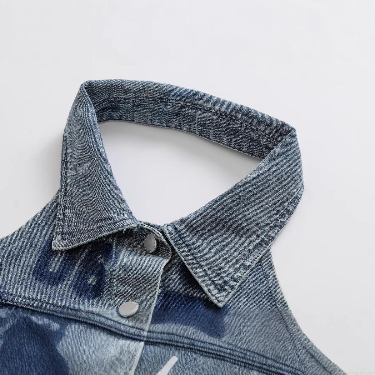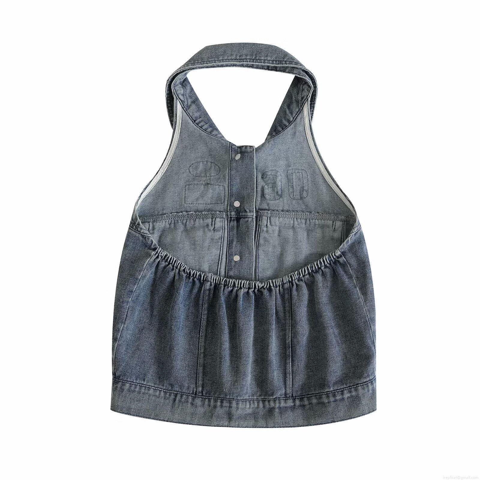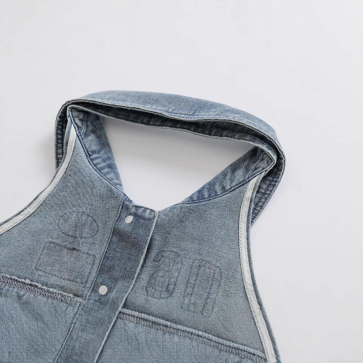 • Women's Dark Blue Denim Halter Neck Crop Top Backless Button Down Sleeveless Vest With Pockets Fashion Streetwear Casual Summer Tank Top For Women