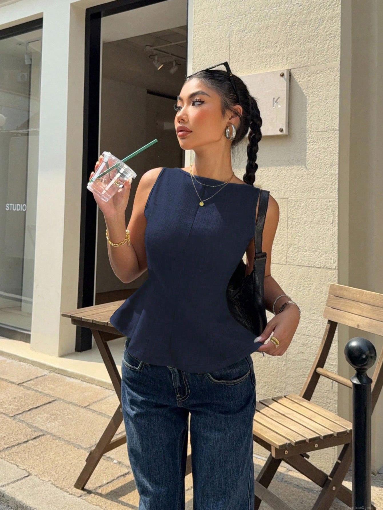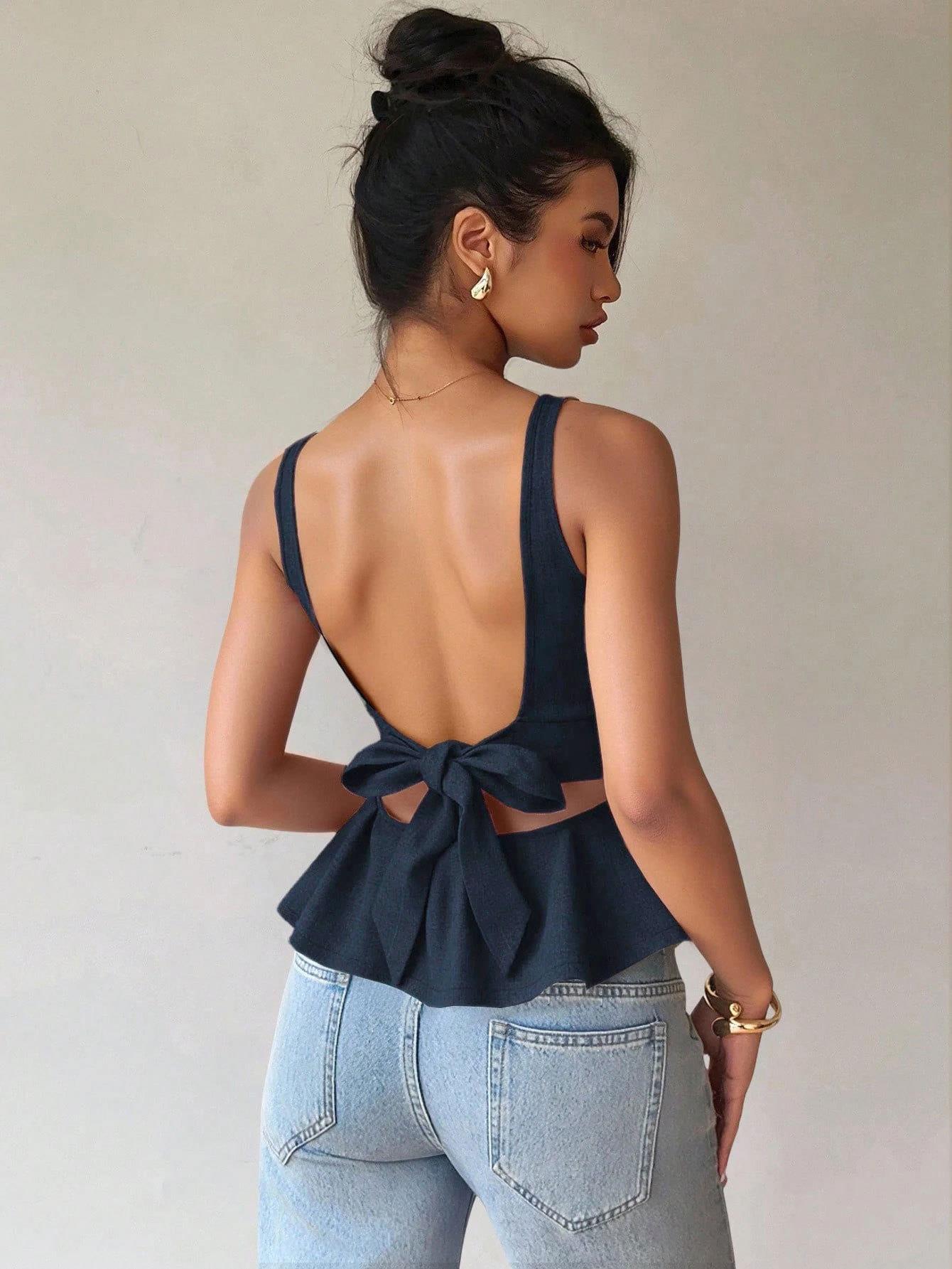 • Women's Elegant Deep Blue Sleeveless Peplum Top Sexy Backless Bow Tie Polyester Elastane Ruffle Hem Blouse for Summer Daily Commuting Dating