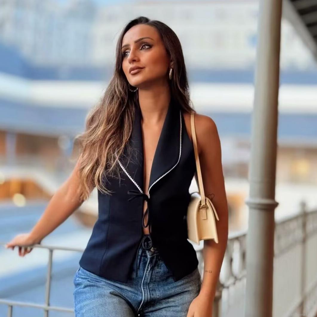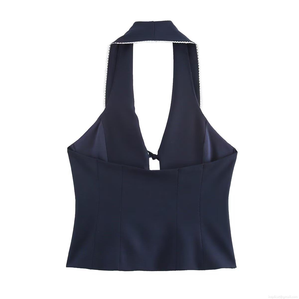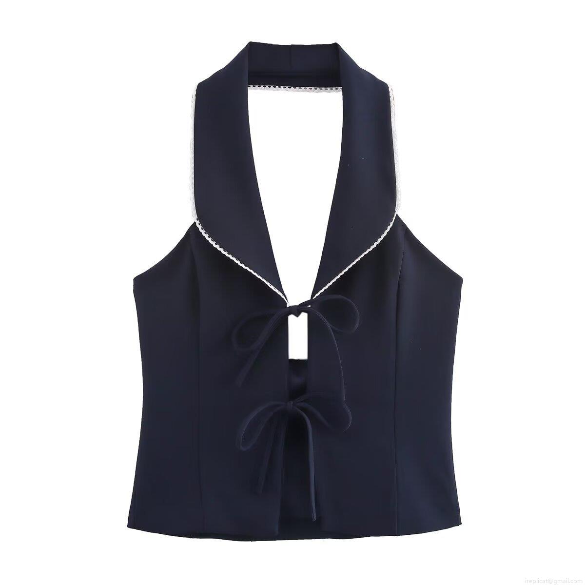• Women's Elegant Halter Neck Top With Bow Knot Slim Fit Polyester Sleeveless Vest Navy Blue Color Block Tank Top For Spring Summer Office Dating