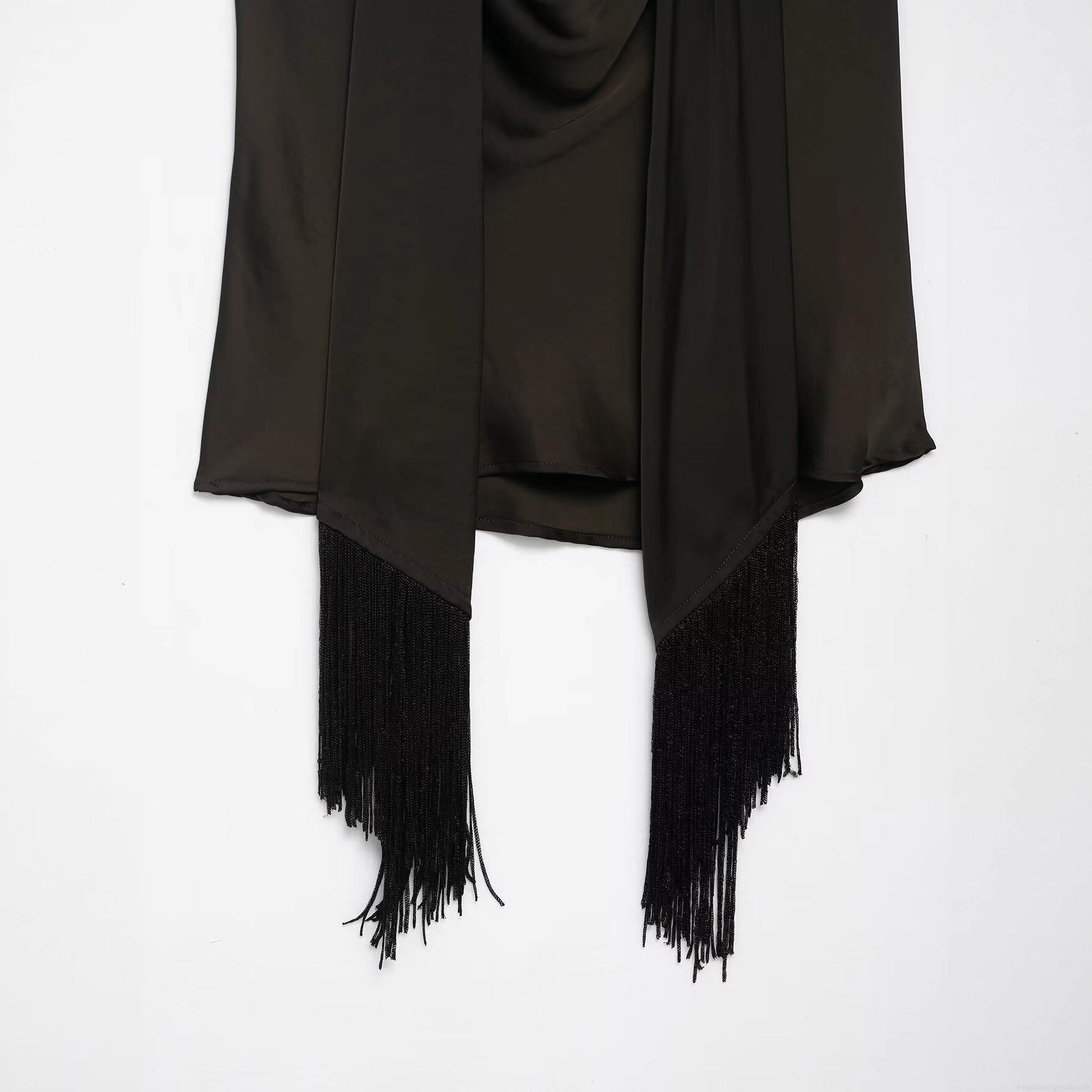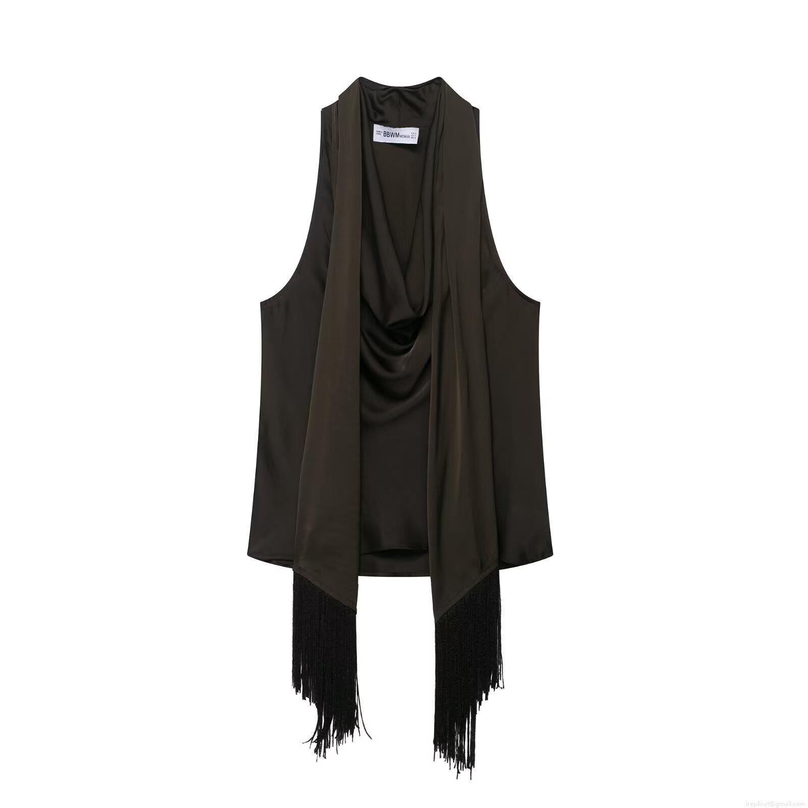 • Women's Elegant Satin Cowl Neck Tank Top With Long Tassel Fringe Sleeveless Loose Fit V-Neck Satin Camisole Blouse For Party Streetwear