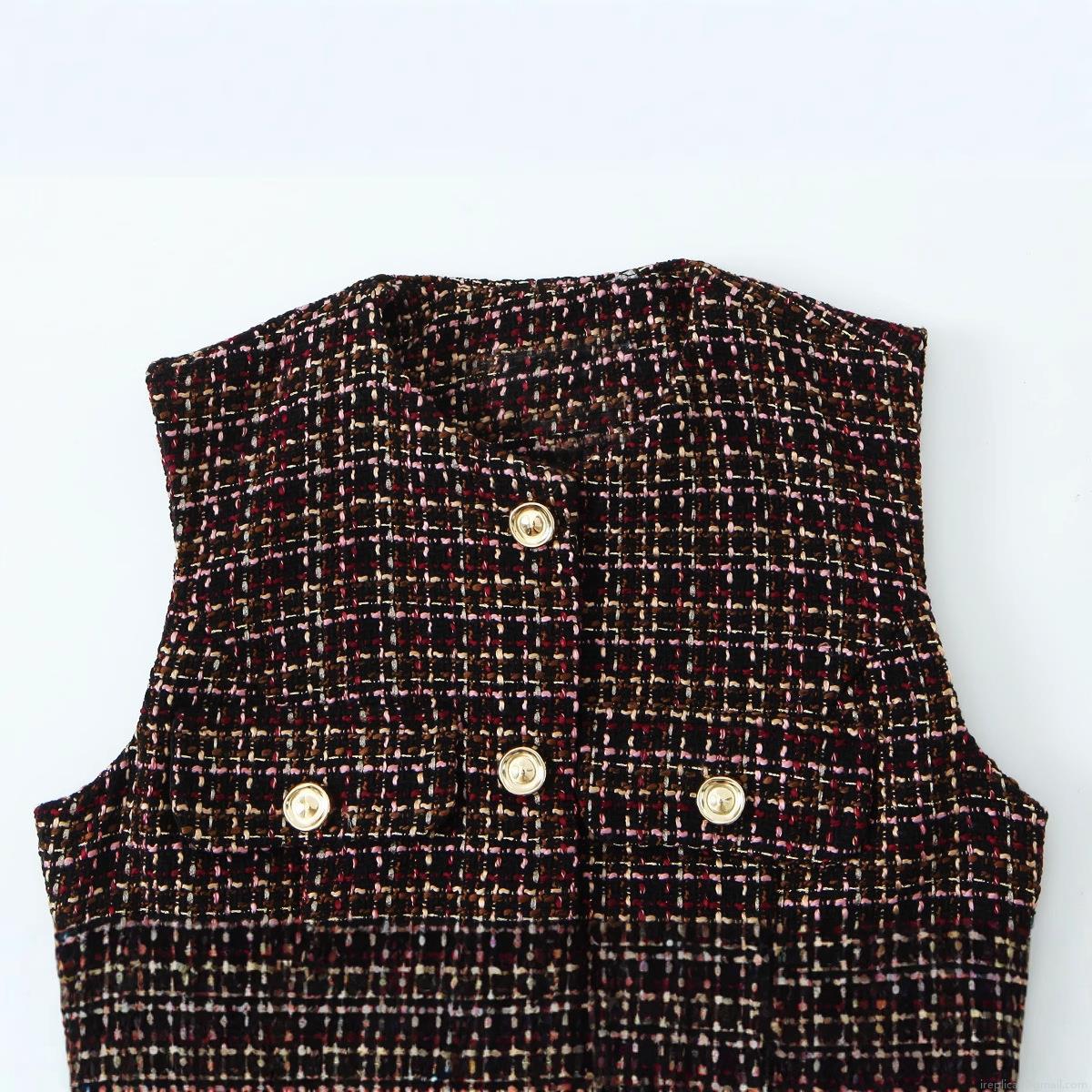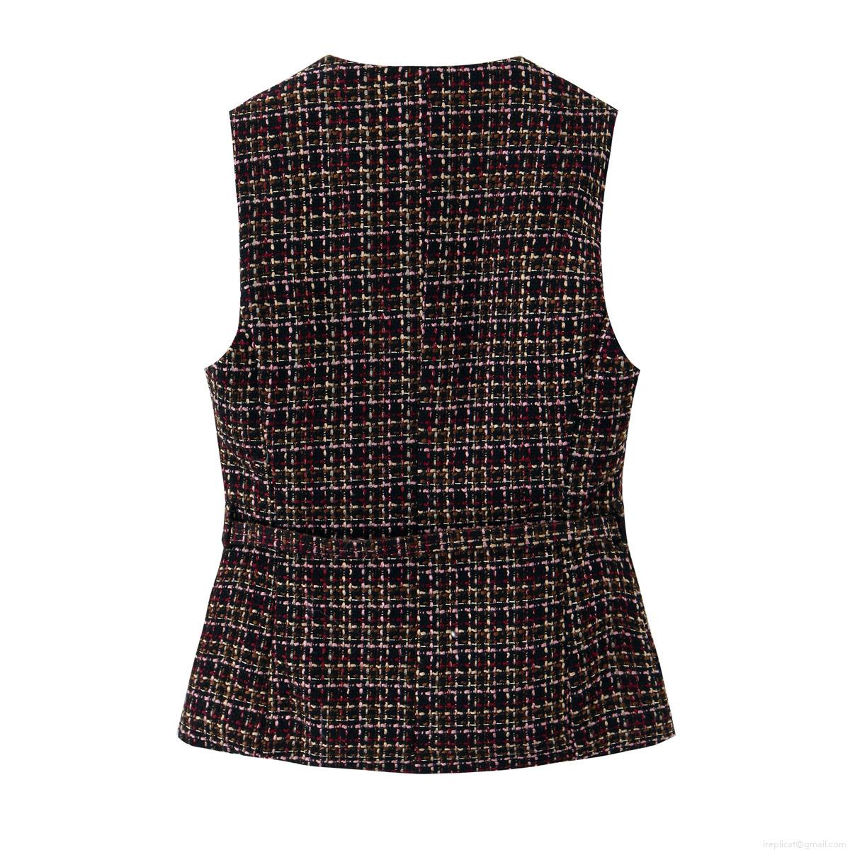• Women's Elegant Tweed Plaid Vest Retro Small Fragrance Style Sleeveless Waistcoat With Belt Gold Buttons Slim Fit Polyester Tank Top For Ladies
