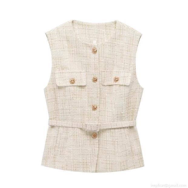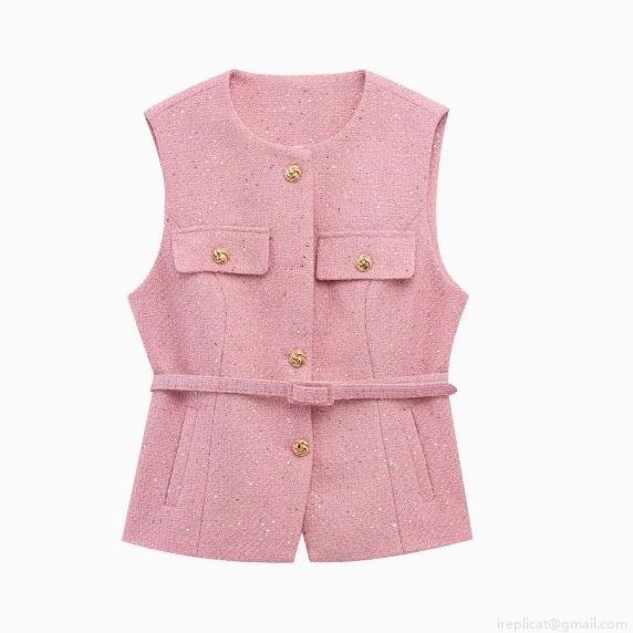 Women's Elegant Tweed Sleeveless Vest Round Neck Button Down Tank Top With Matching Belt Shiny Sequin Waistcoat For Office Party Lady Outerwear